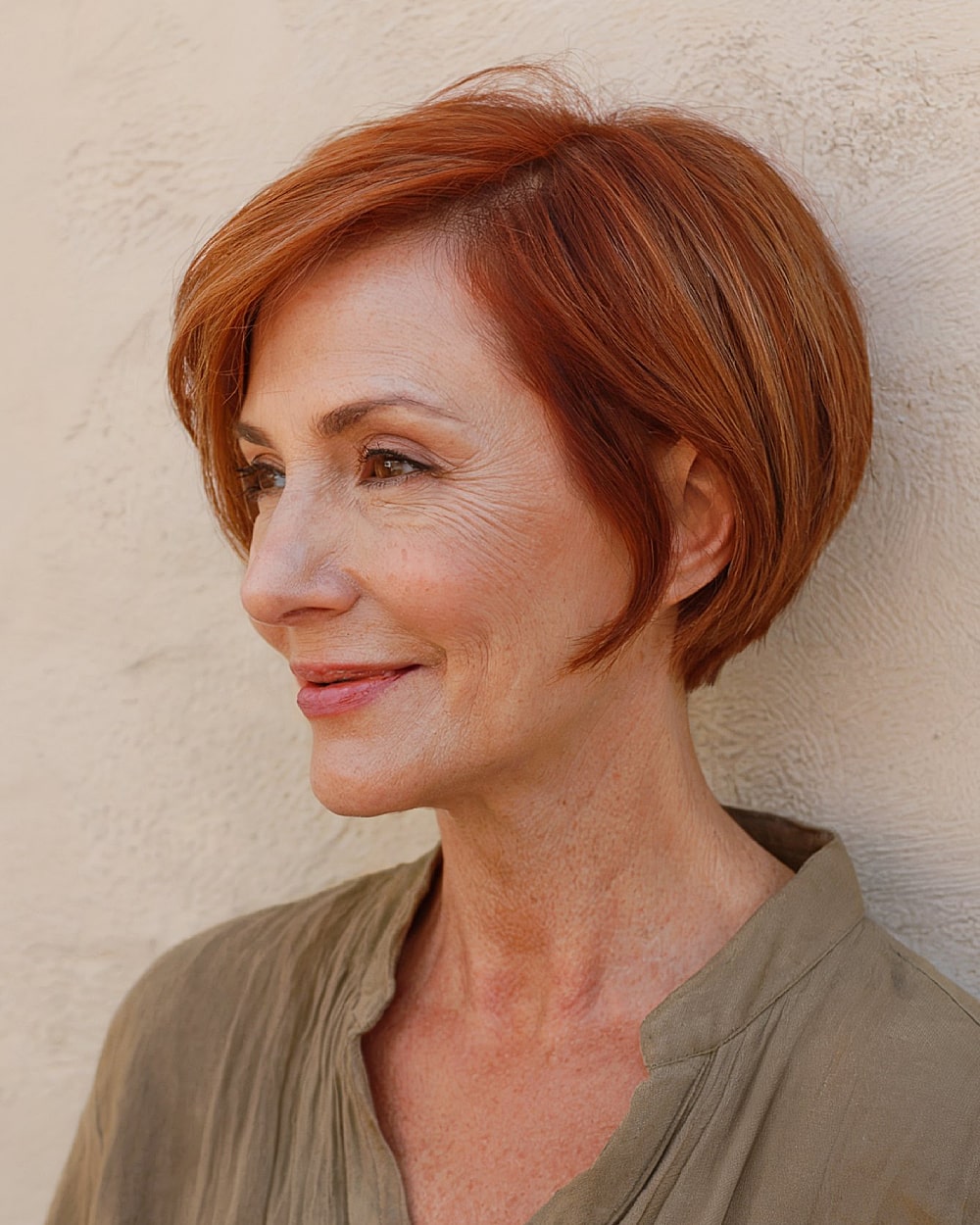 This curved auburn pixie bob hugs the head beautifully with sleek lines that contour the cheekbones. The warm auburn color adds brightness to mature skin and pairs well with neutral or cool undertones. A sculpted shape like this is best for medium to dense hair and flatters longer or narrow face shapes. The precise cut requires regular shaping to maintain the curve, but the minimal layering keeps it sleek and manageable. It’s ideal if you like polished but not fussy styles.