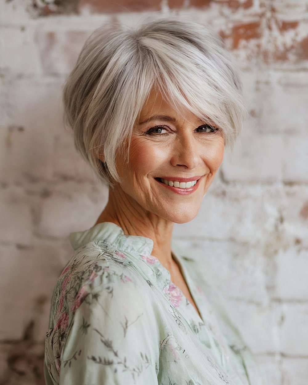 Lightweight and flattering, this tapered silver pixie bob is great for women over 60 who want softness with structure. The tapered nape gives the cut a neat, lifted look while the longer, feathery layers at the crown and sides add volume—perfect for finer or thinning hair. The side-swept fringe softens forehead lines and works nicely on oval or heart-shaped faces. It’s an easy, low-maintenance option that still looks styled, but may need root touch-ups for dimensional silver tones.
