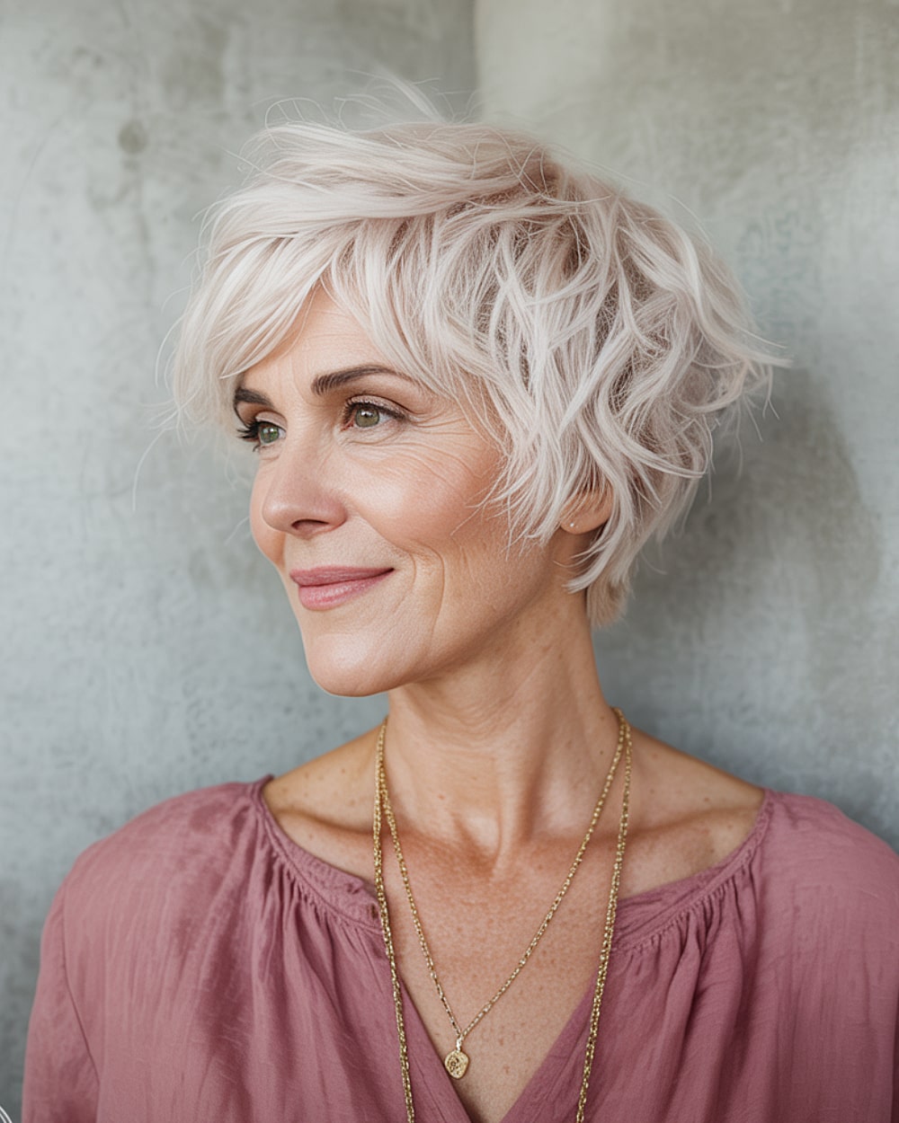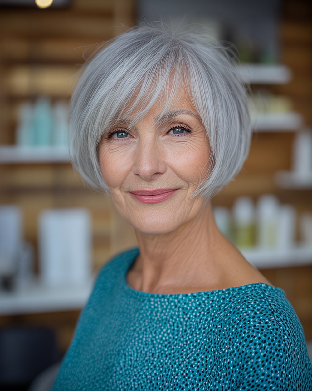 Bold meets graceful with this layered pixie bob featuring a subtle undercut and sweeping waves. It’s edgy without being over the top, and the asymmetry helps elongate round faces. Perfect for women over 60 who still want personality in their look. The undercut removes weight at the nape, while the layered waves on top add lift. Works best on thick or coarse hair with some natural wave. A root-lifting spray or diffuser can help enhance the volume and structure.