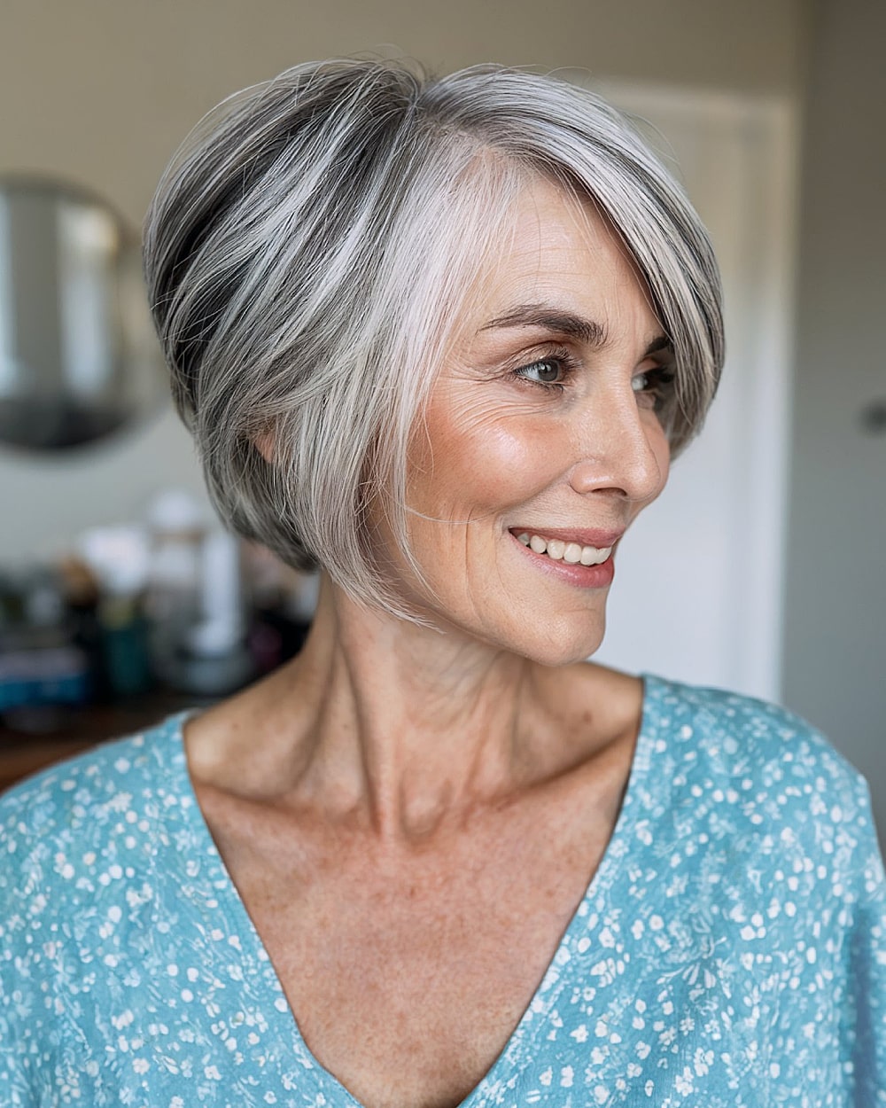 Feathered layers and a side-swept lift give this pixie bob airy movement and a youthful boost. It works beautifully on fine, straight to slightly wavy hair and adds fullness without being too structured. The cut grazes the nape and elongates the jawline gently—perfect for oval or heart-shaped faces. Ideal for women over 60 looking to soften facial features while lifting their look. The gray blending and smooth feathering at the crown are low-maintenance yet flattering.
