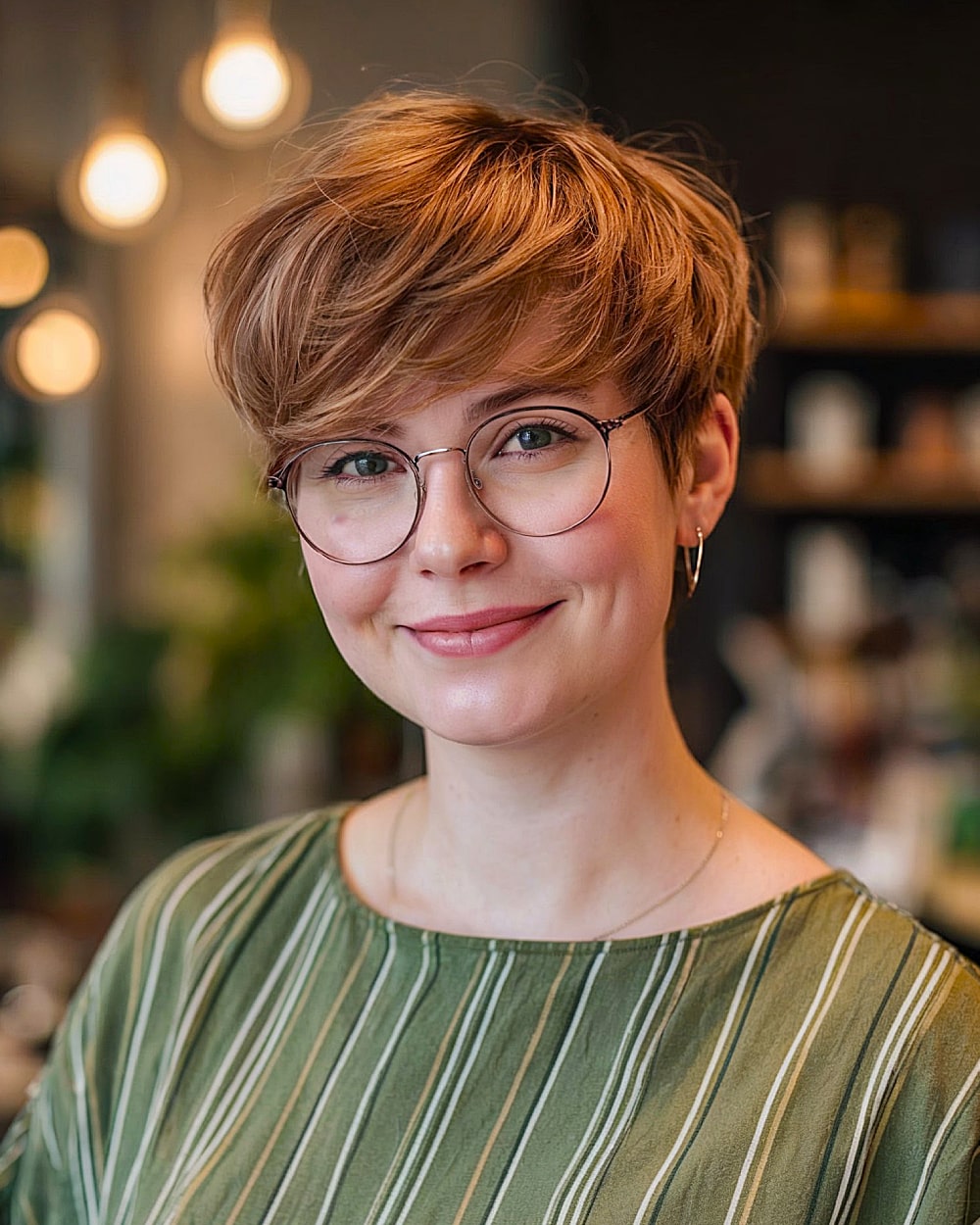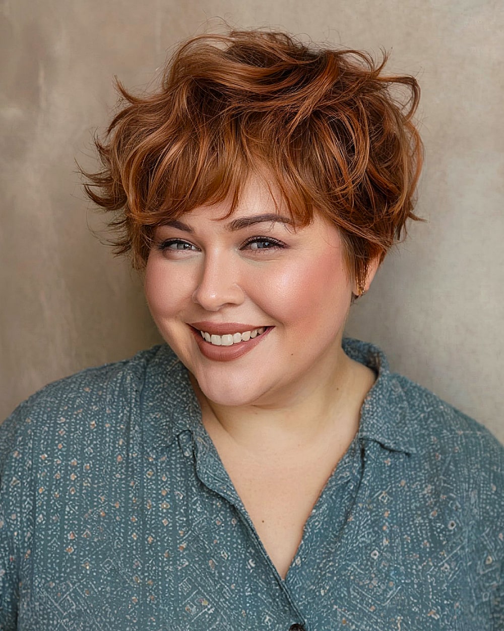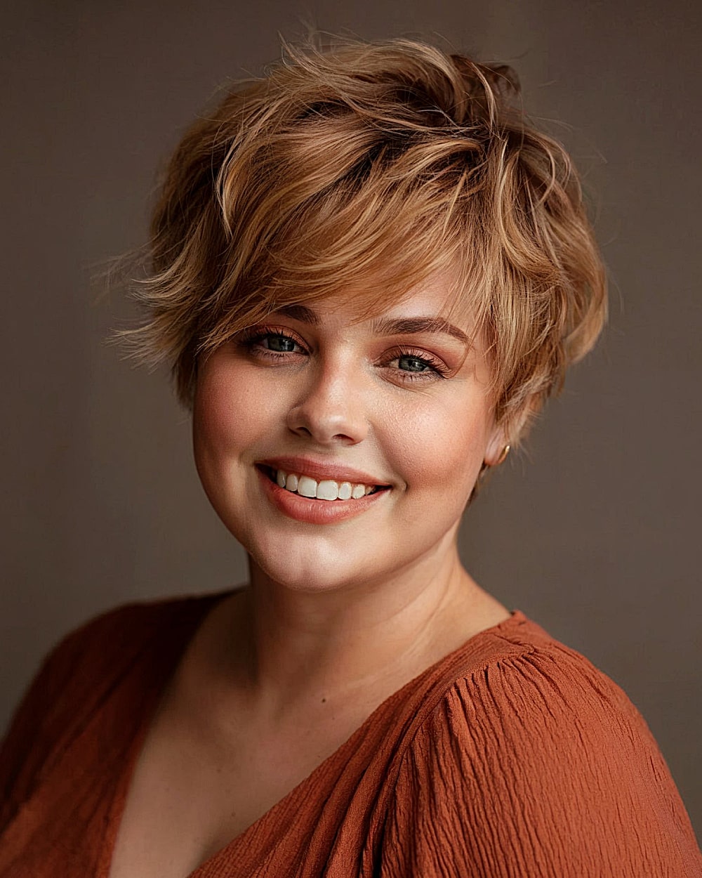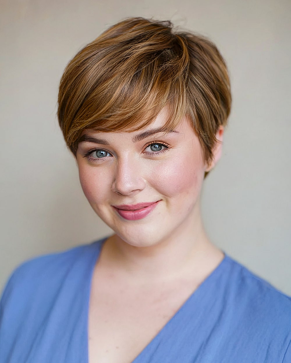 A long, layered side fringe balances a rounder cheek area beautifully in this pixie. That angled front adds length visually, while the layered crown builds subtle volume up top. Ideal for women with straight to slightly wavy hair, this style helps elongate the face without harsh lines. The copper hue adds warmth and enhances fine hair. You’ll need a round brush and blow-dry for that smooth finish.
