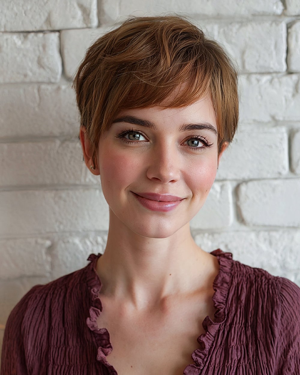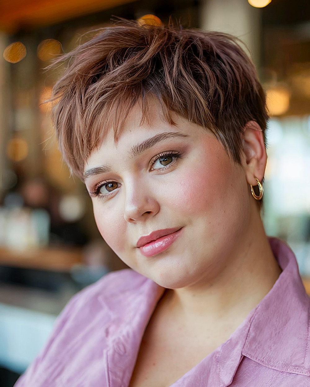 Feathered layers and a soft taper keep this pixie light and flattering on a round face. The ash brown color cools down the look, making it modern and refined. It’s especially great for fine to medium hair—those wispy bangs help contour the forehead without making it look too heavy. The downside? It does need regular shaping to keep the taper neat around the ears and neckline.