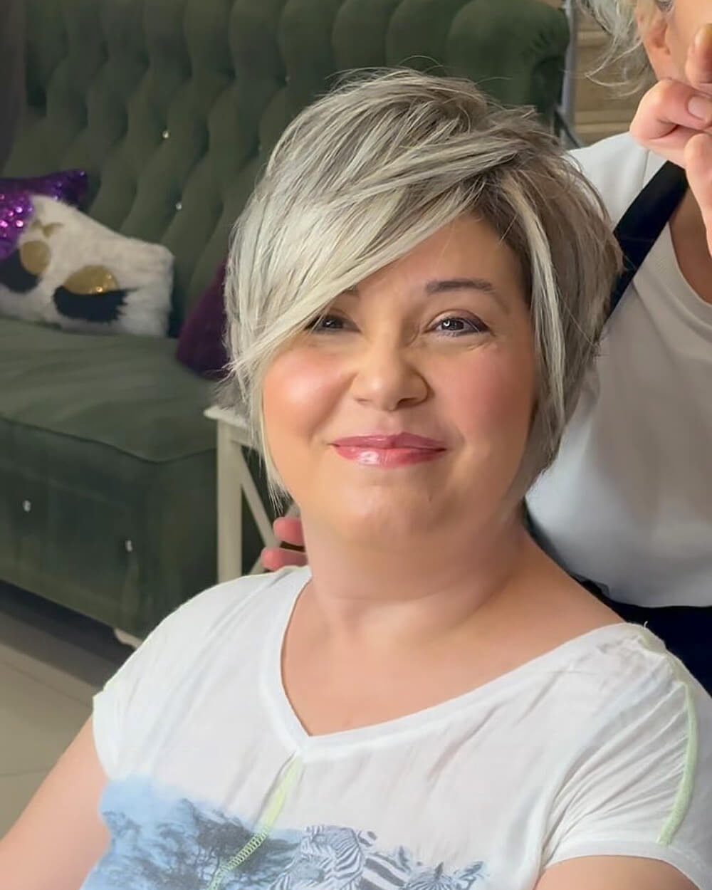 A blonde bixie with a side-swept fringe may be what you need to have a much-needed glow-up! This cut has helped a round face look slimmer by having a length at the bottom but creating height with some pixie layers. From brunette to blonde can make you go from drab to fab!
