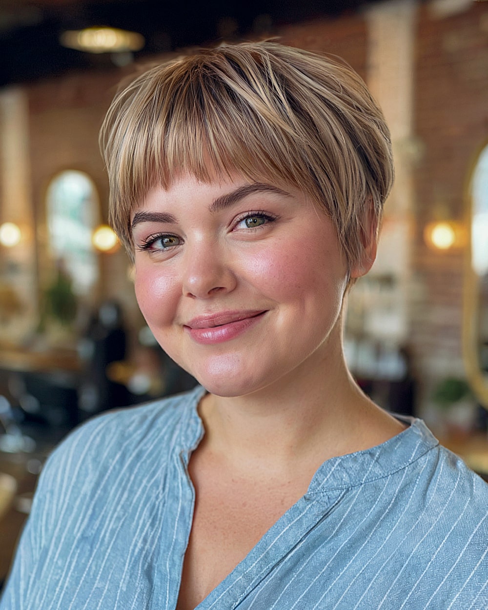 This classic pixie has a clean silhouette with a subtle rounded fringe that hugs the brow line—great for softening rounder features. The beige blonde tones give it a calm, modern finish. Best for fine hair, as the compact shape doesn’t overwhelm. It’s tidy and low-fuss but needs a precise trim to stay balanced. Especially flattering on smaller frames or petite facial features.
