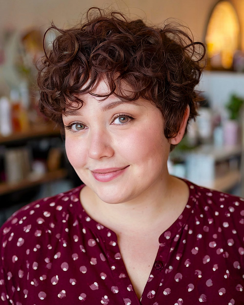 Natural curls shine in this soft, feminine pixie that hugs a round face just right. The layers break up density and give the curls room to spring, while the overall shape avoids bulk around the cheeks. It’s flattering for women with naturally curly or coily textures and works beautifully on thicker hair. Moisture is key—use a curl cream or defining gel to maintain bounce without frizz.