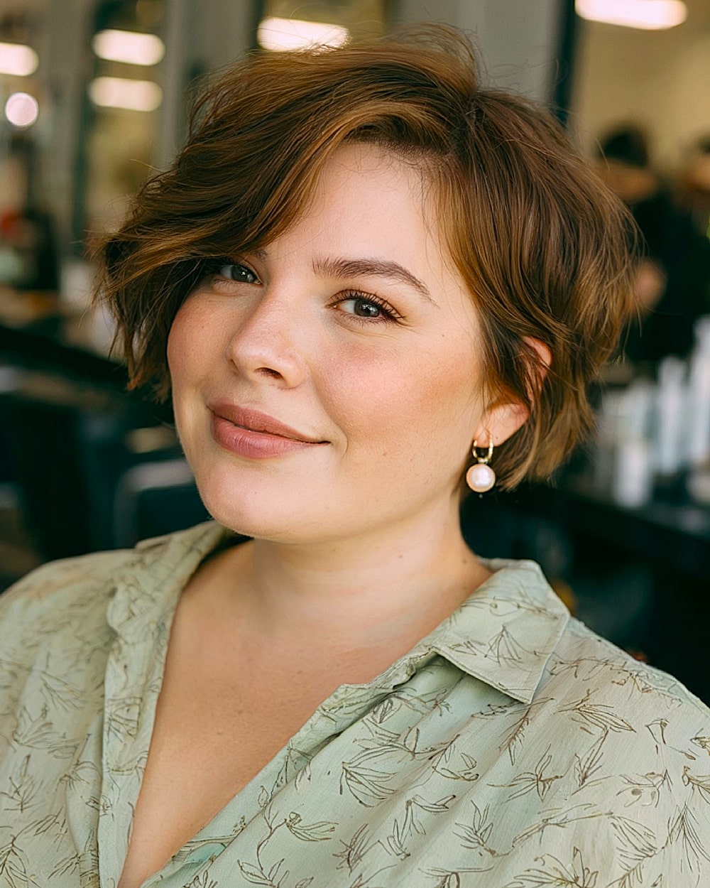 That deep angled side part and soft bend through the front give this pixie a flattering, face-framing effect for rounder cheeks. It’s a low-effort style that works best on slightly wavy or thick straight hair. The tousled side-swept shape gives movement without puffiness. A soft mousse and light finger styling are all you need for daily wear. Plus, the natural brown tone keeps it approachable and easy to maintain.