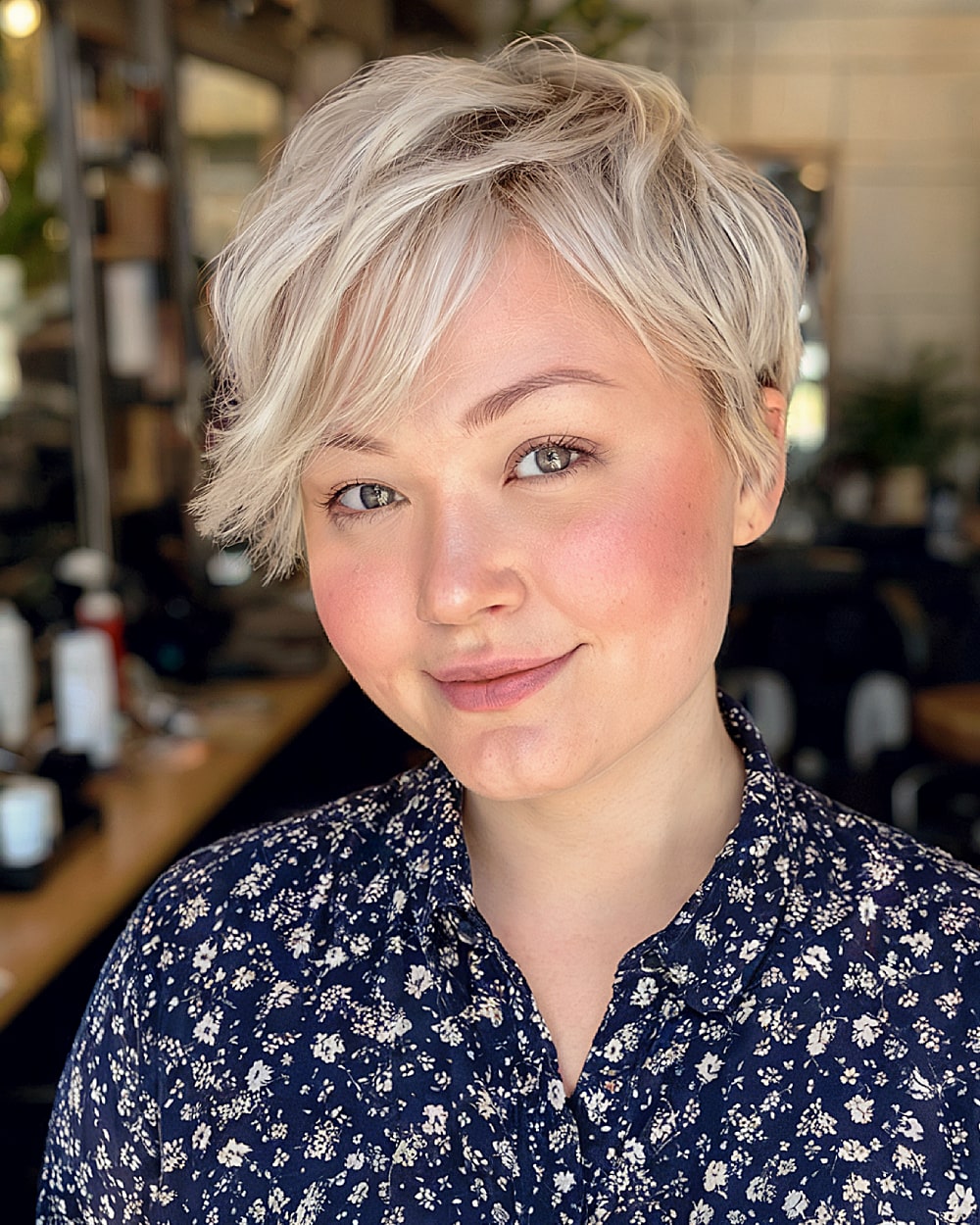 A long pixie cut for round-faced women should be kept soft but with piece-y bangs and extra layers. Added texture creates the extra volume and fullness needed.