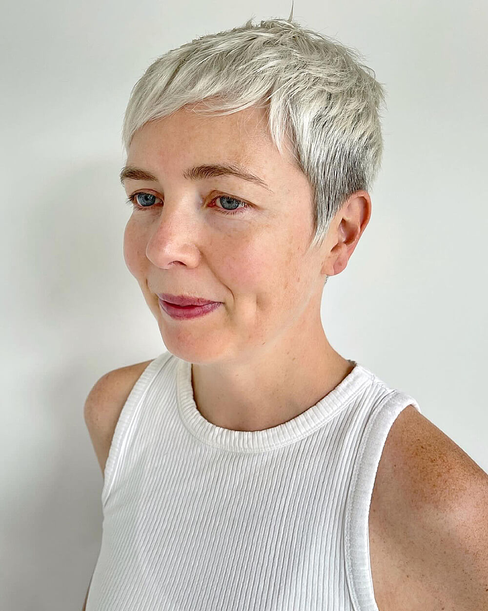 If you want to maximize thin hair, try a white-gray pixie. Combining short, textured tresses and super light hair color will create an illusion of density and thicker hair.