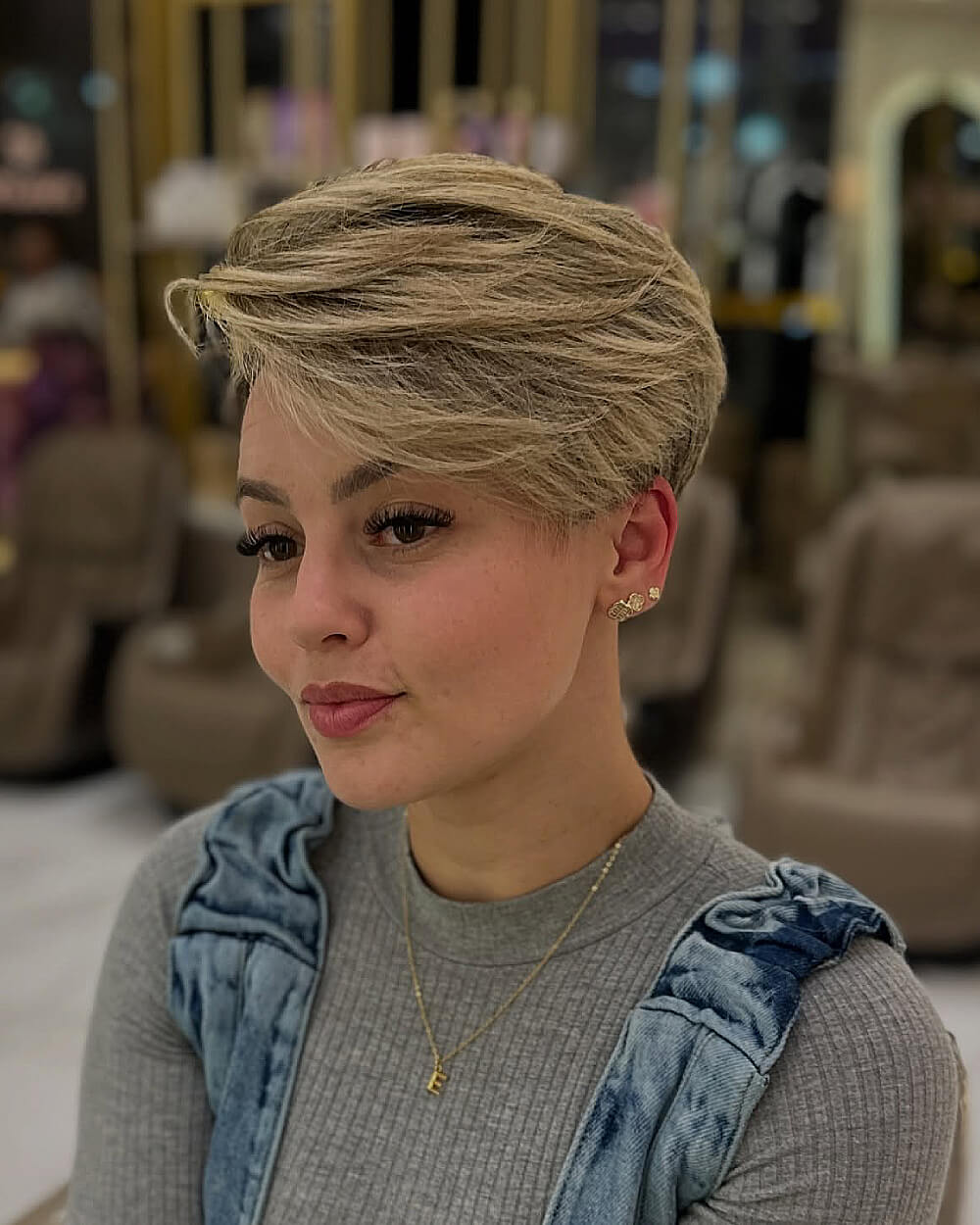 This pixie bob offers the best of both worlds—short enough for easy upkeep, long enough to play with styling. The feathered ends and subtle inward bend at the nape create a soft silhouette, great for women with finer hair. Works well on longer or angular face shapes. The warm highlights throughout add movement and dimension without being overdone.