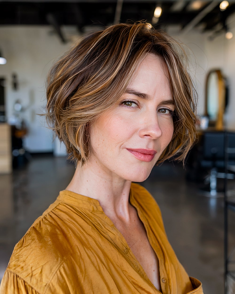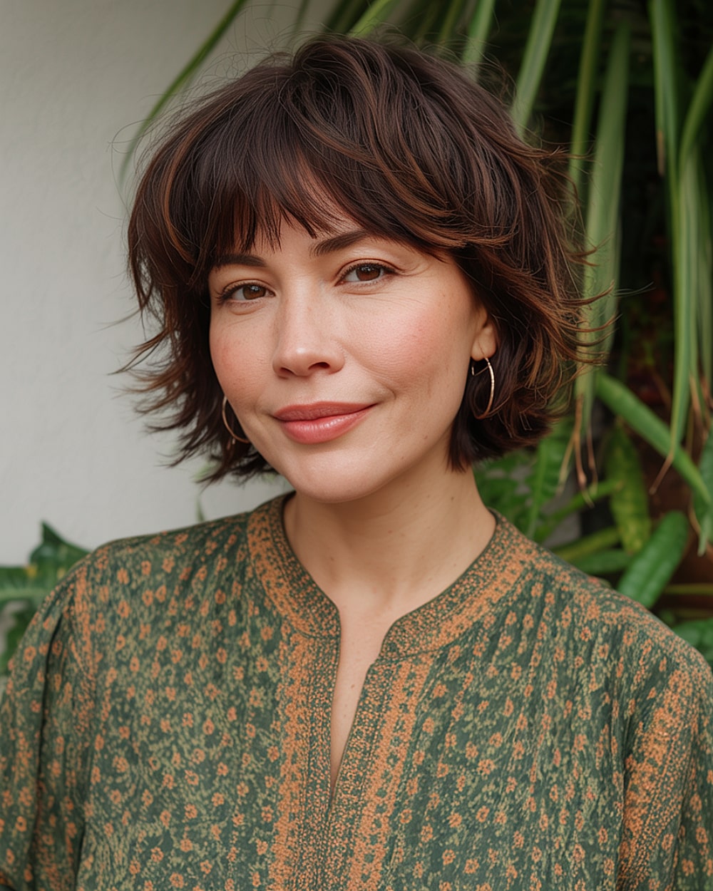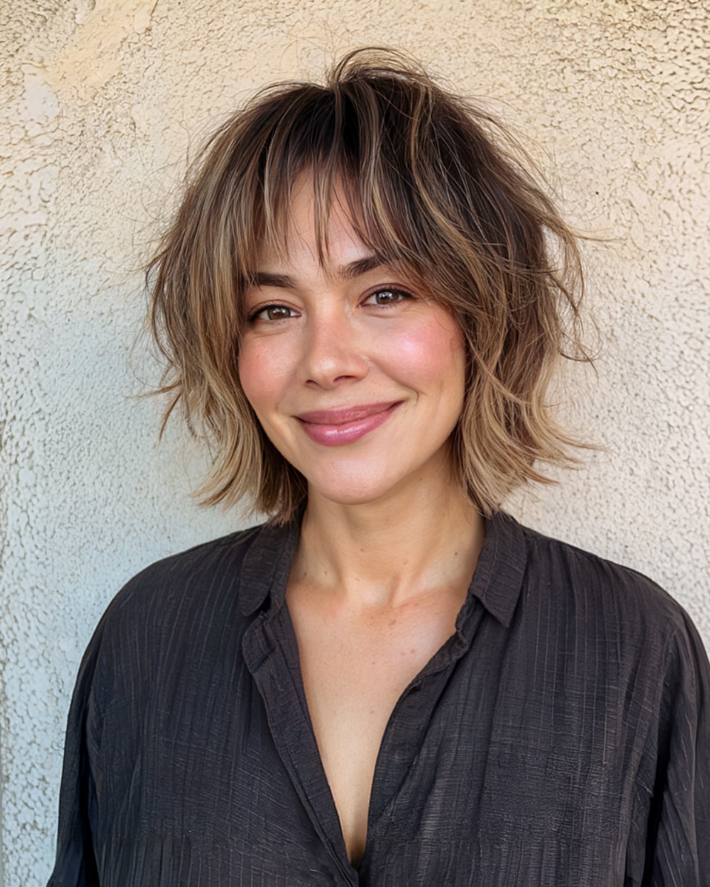 This short shag is full of face-framing action—great for downplaying a wider upper face. The feathery layers taper inward at just the right points. It flatters thick to medium-density hair that can hold some shape. On super fine or straight textures, the shag might fall limp without styling help. Great for 30s and up, it’s easygoing but definitely not boring. Bonus: it grows out gracefully.