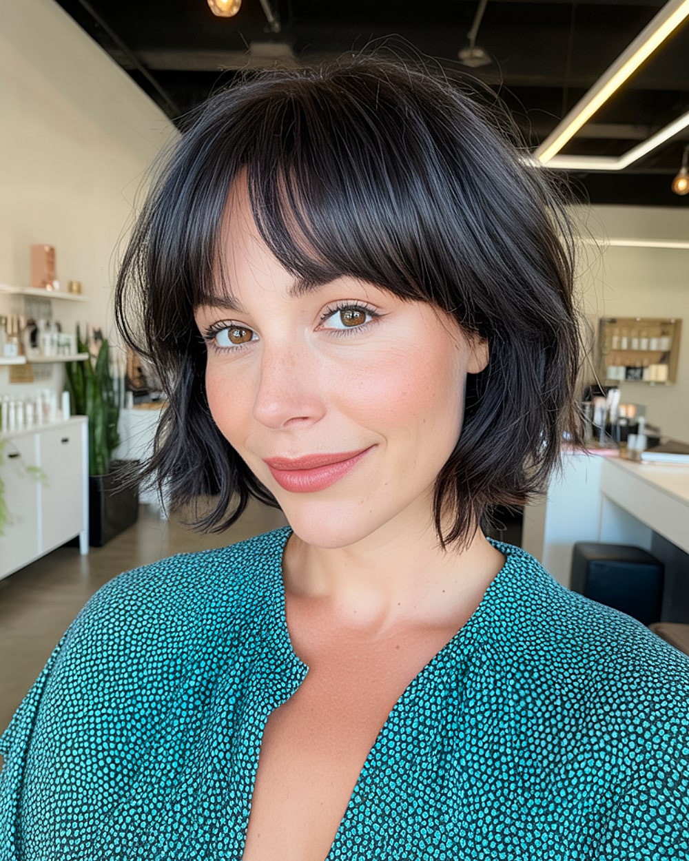 The messy finish and delicate fringe give this look a breezy, unfussy charm. Perfect for heart shaped faces, the fringe covers a wider forehead while the texture breaks up fullness in the cheeks. It suits light to medium-density hair best. If you’ve got very fine strands, you might need texture spray for volume. It’s a low-commitment style that still feels stylish and wearable day-to-day.