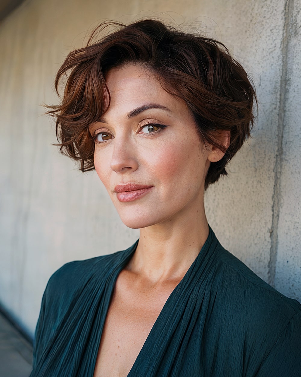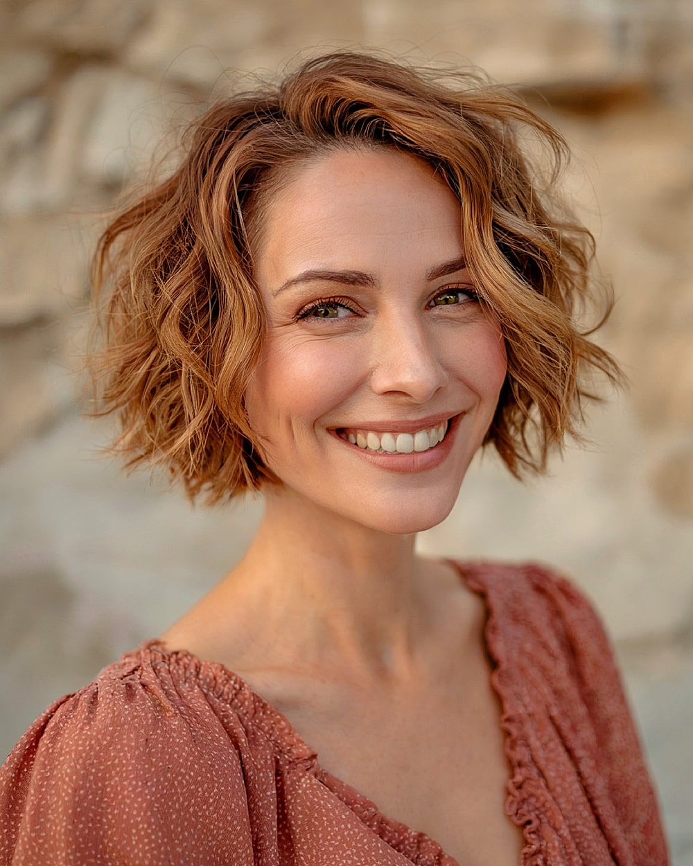 Side parts are magic for heart shaped faces—they break up symmetry and pull focus sideways. This short wavy bob softens angular lines and offers natural bounce, especially for fine to medium density. The waves add fullness near the chin, which helps counterbalance a wide forehead. Curls may drop in humidity, but a touch of curl cream fixes that. A flattering and romantic cut for women 30s and up.