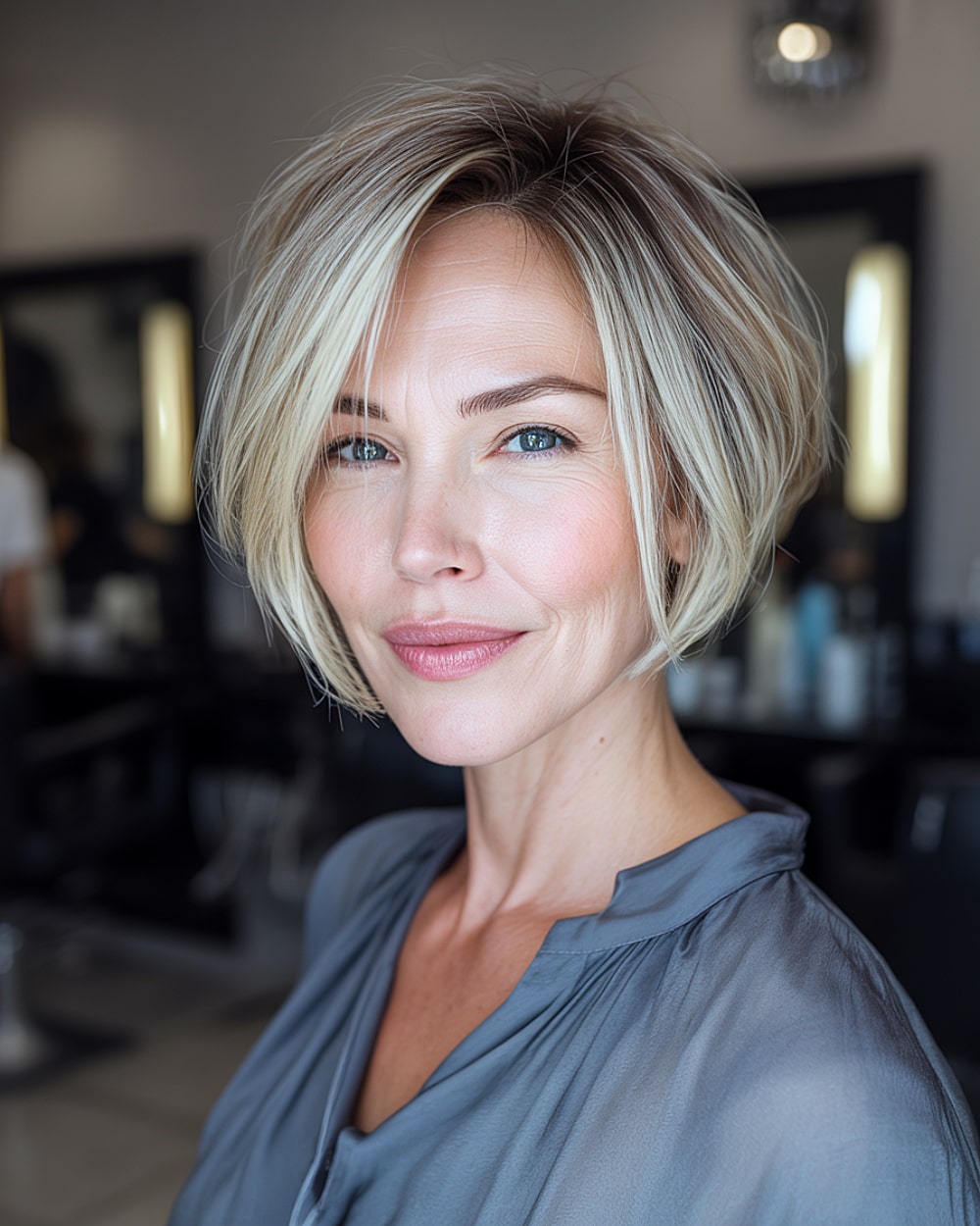 The root shadow adds depth while the balayage brightens the lower face—a great combo for heart shaped features. This bob grazes the chin just enough to balance out a wider upper face. Ideal for fine to medium textures that need visual volume without weight. The downside? You’ll need regular toning to keep the blonde fresh. A go-to for soft structure with low-maintenance regrowth.