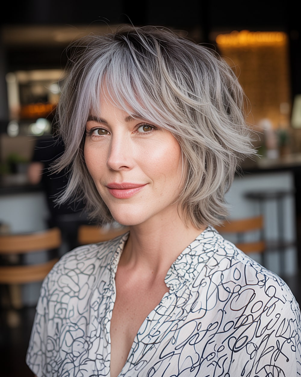 Side-swept bangs soften a strong forehead and draw attention to the eyes, balancing the heart shaped face beautifully. This short cut gives a clean finish while keeping the fringe feminine and light. Ideal for straight to slightly wavy hair with low to medium density. If your hair’s coarse or stubborn, the bangs may require more heat styling. It’s timeless and modern all in one—especially nice with glasses!