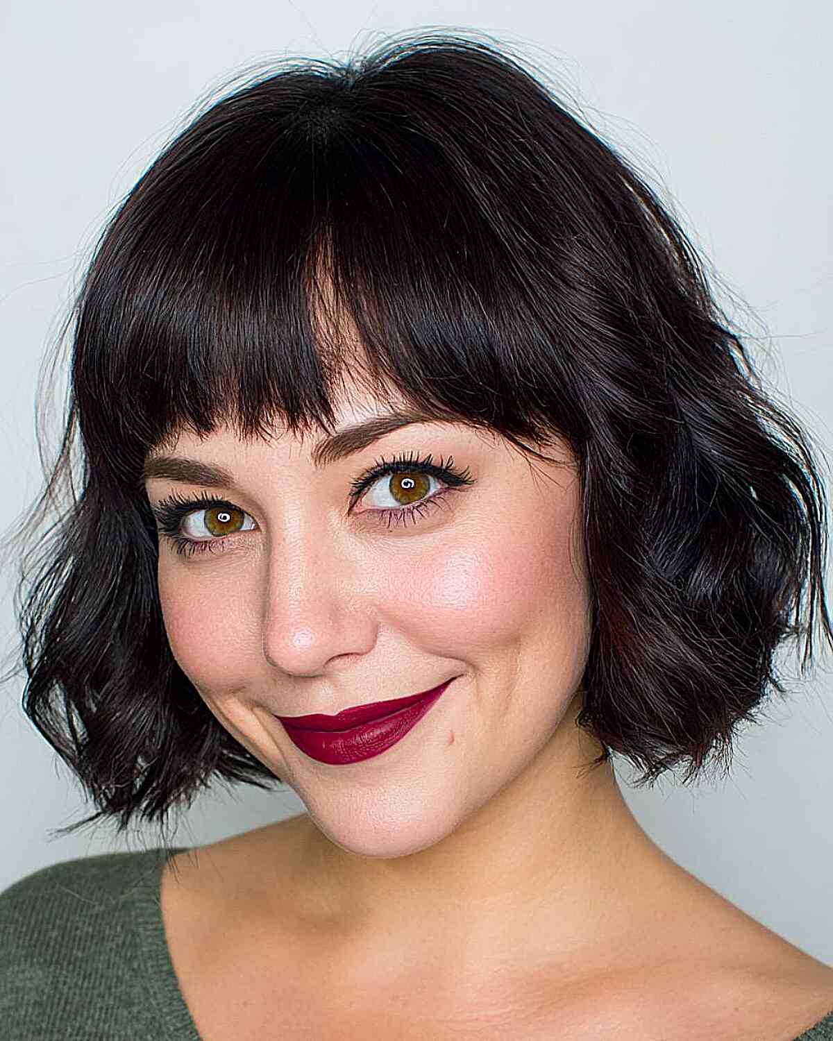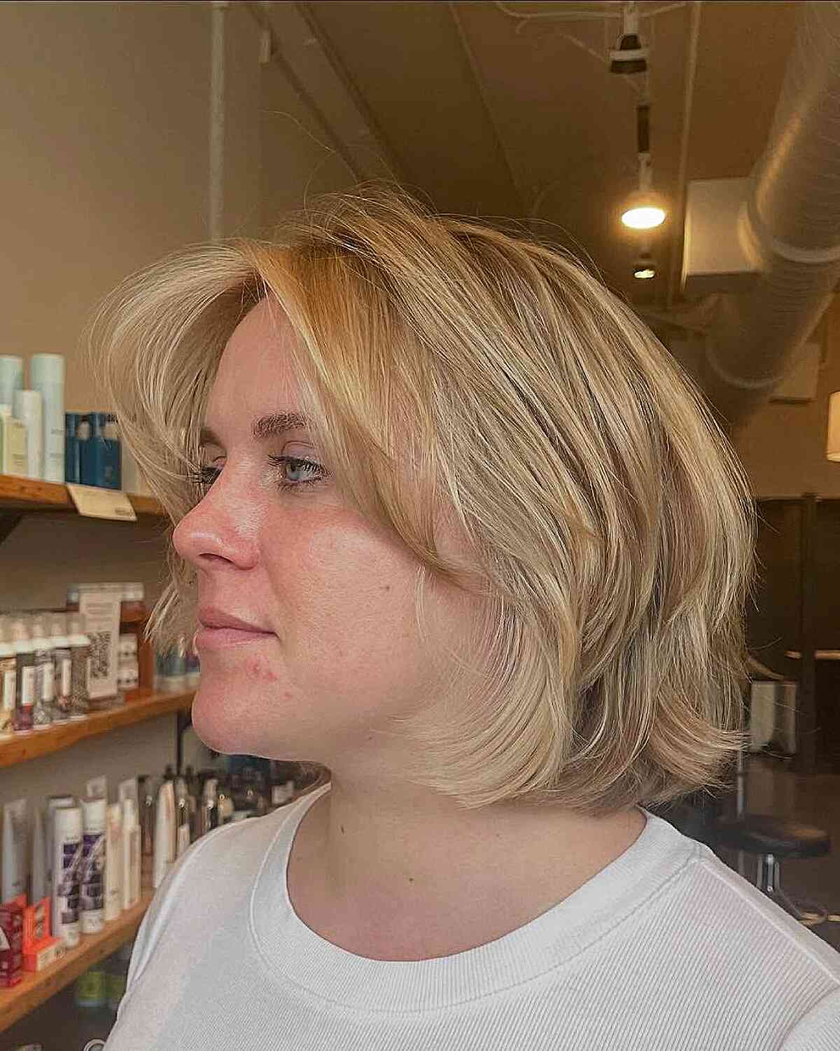 This short layered bob features soft curls that create volume and movement, flattering round face shapes. The side part enhances asymmetry, elongating the face. Best for medium-density wavy hair, this cut gives a fuller look without adding bulk. It’s easy to style with a diffuser and curl cream for definition.