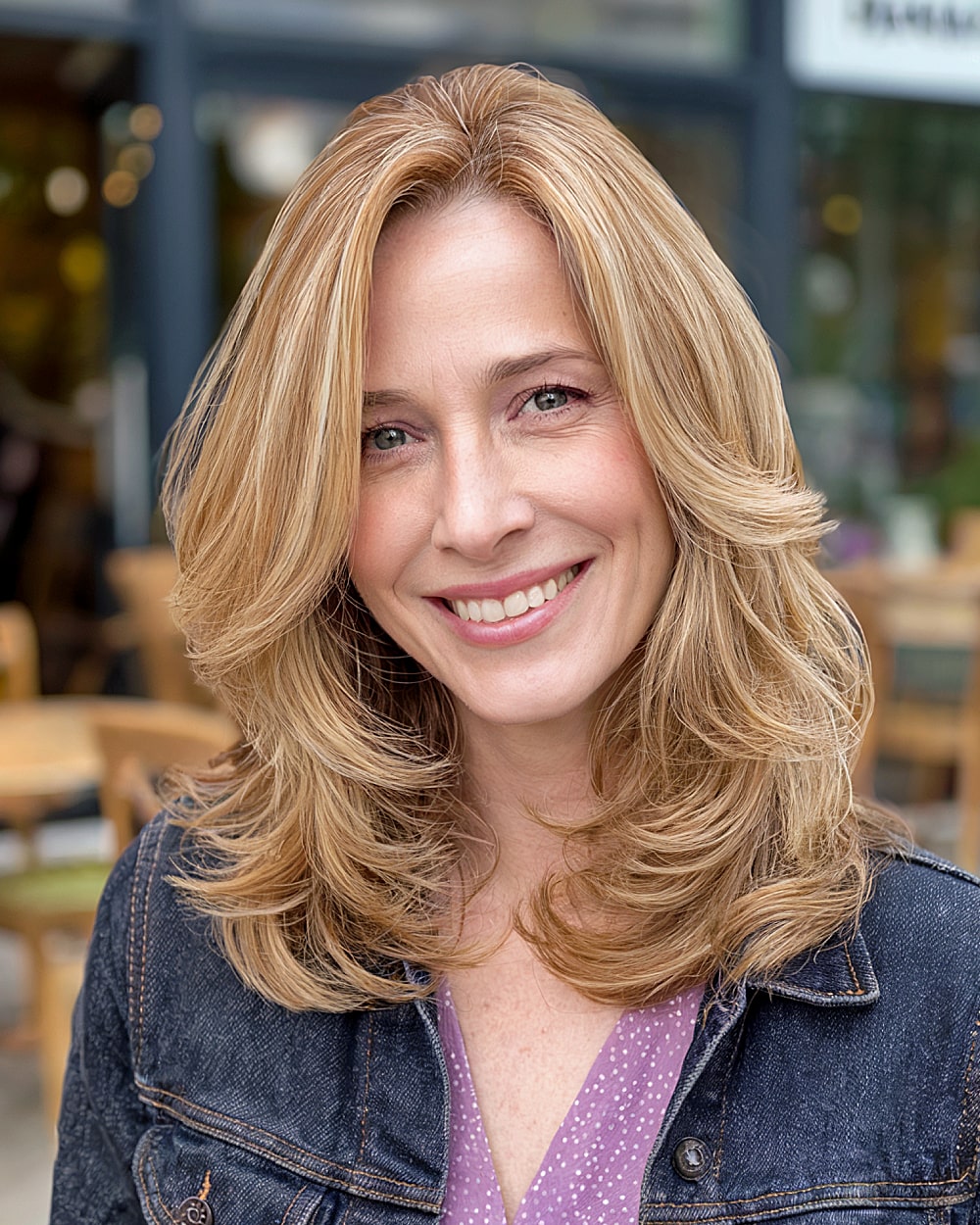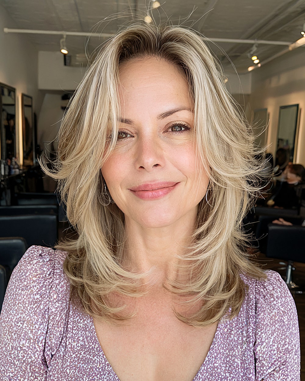 A soft, mid-length butterfly cut that skims the shoulders offers a great low-maintenance option for women in their 40s with finer hair. The rounded layers add fullness through the crown without thinning the ends too much. This honey-blonde tone brightens the face and pairs beautifully with lighter skin tones. Works well on oval or long face shapes but might fall flat without a blowout or root lift on finer textures.