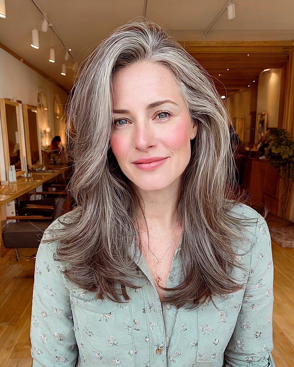This soft butterfly haircut enhances natural gray blending with beautifully sculpted layers that frame the face and lift the crown. The silvery streaks add natural contrast that makes the feathered layers pop, especially around the jawline and ends. Best for medium to thick hair with a bit of wave or body. A side part helps create extra lift, flattering longer or oval face shapes. Minimal upkeep makes it perfect for low-fuss gray transitioners.
