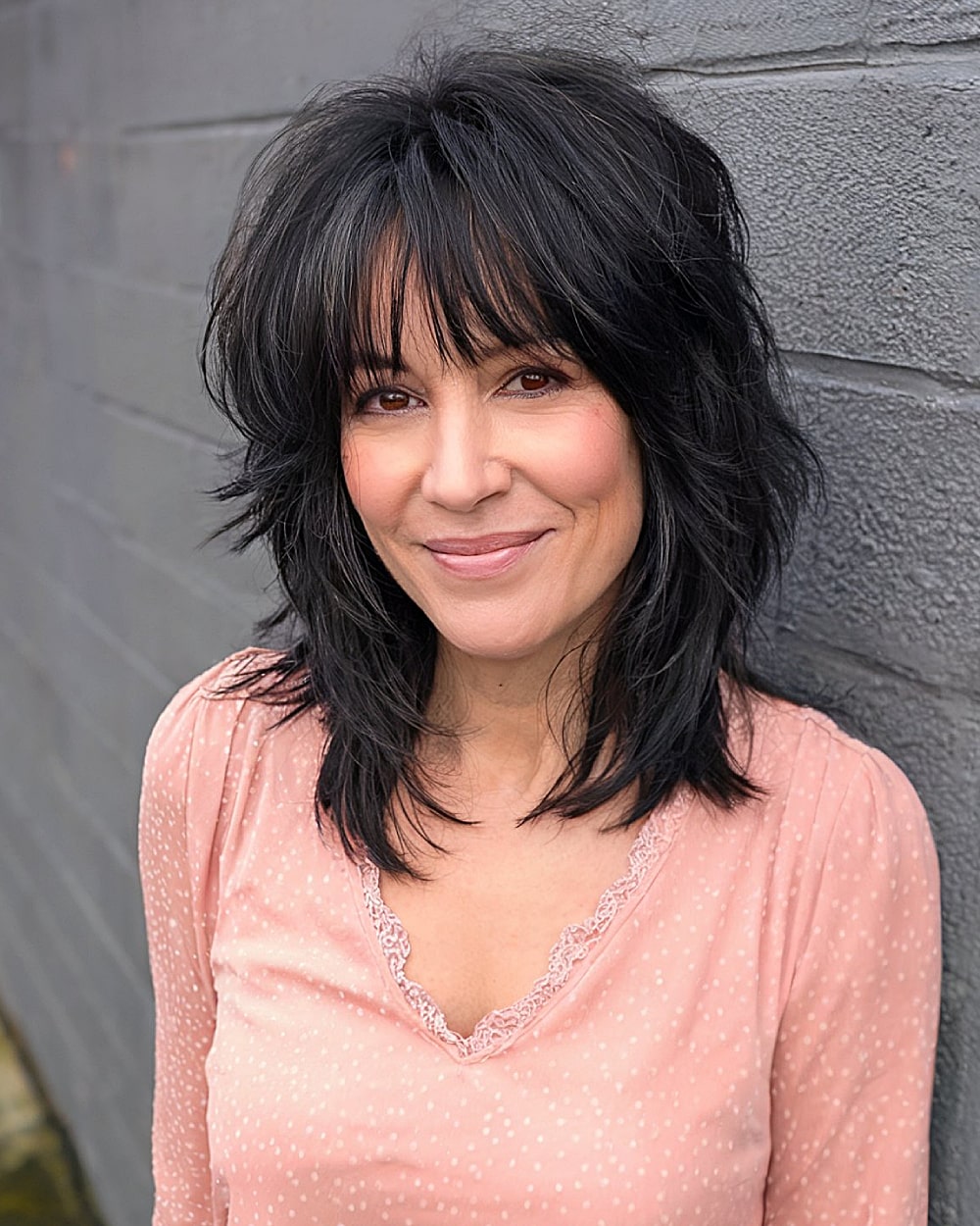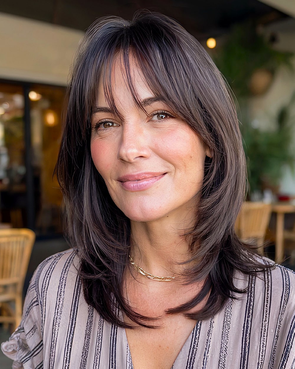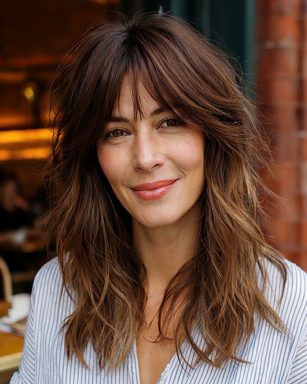 With choppy layers and a soft, tousled finish, this butterfly cut has a casual edge that’s great for women in their 40s who want something easy but stylish. The curtain bangs frame the eyes and blend into mid-length layers that give movement without losing thickness. The muted chestnut brown keeps it soft and natural-looking. Ideal for medium-density, wavy hair types that can hold shape without much styling.