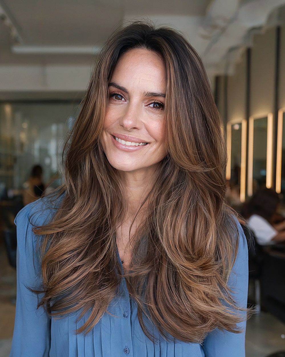Long, swoopy layers paired with subtle face-framing pieces make this butterfly haircut a flattering option for women with medium to thick hair. The length maintains versatility, while the internal layers keep weight off the face, giving a gentle lift to the cheeks and jawline. Ideal for women in their 40s with oval or heart-shaped faces who want movement without losing length. The soft chocolate brown color adds warmth without overpowering.