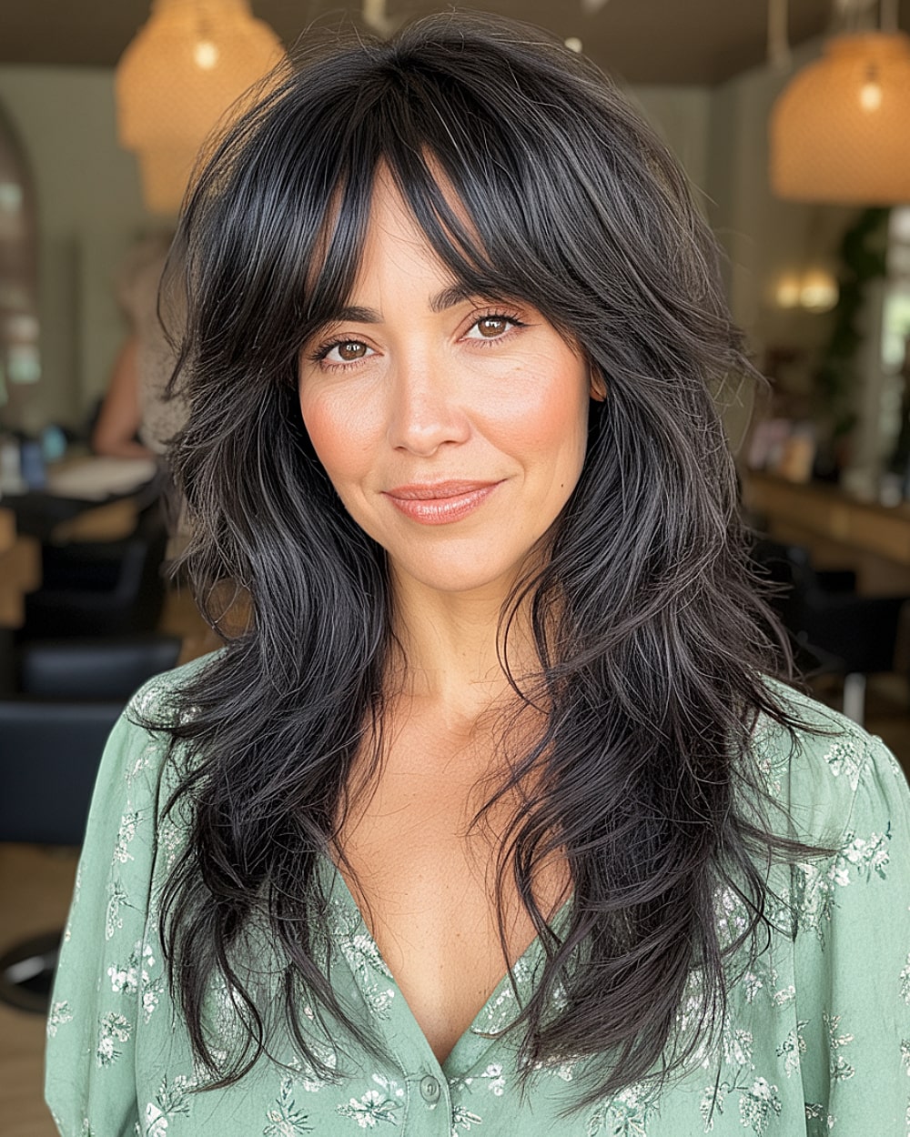 Bold curtain bangs meet shaggy, face-framing layers in this edgier take on the butterfly cut. Perfect for women over 40 who want a youthful, undone look without going short. The choppy texture works well with naturally wavy or fine to medium density hair, adding volume and shape around the crown. Best for heart or diamond face shapes. The inky black color enhances the layers’ depth and drama—just know it’ll need dry shampoo on off days.