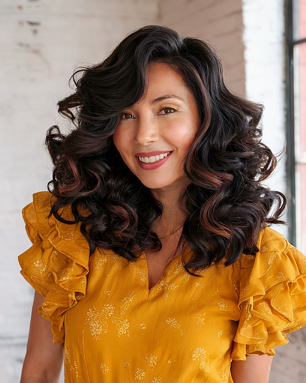This butterfly cut comes alive with voluminous, vintage-inspired curls and face-framing lift. Auburn ribbons woven into dark hair add stunning dimension and shine. Best for women in their 40s with naturally curly or heat-styled dense hair who want bounce without heaviness. The side-swept styling opens up the face beautifully but does require a curling iron and set spray for hold. A glamorous option for special occasions or bold everyday looks.