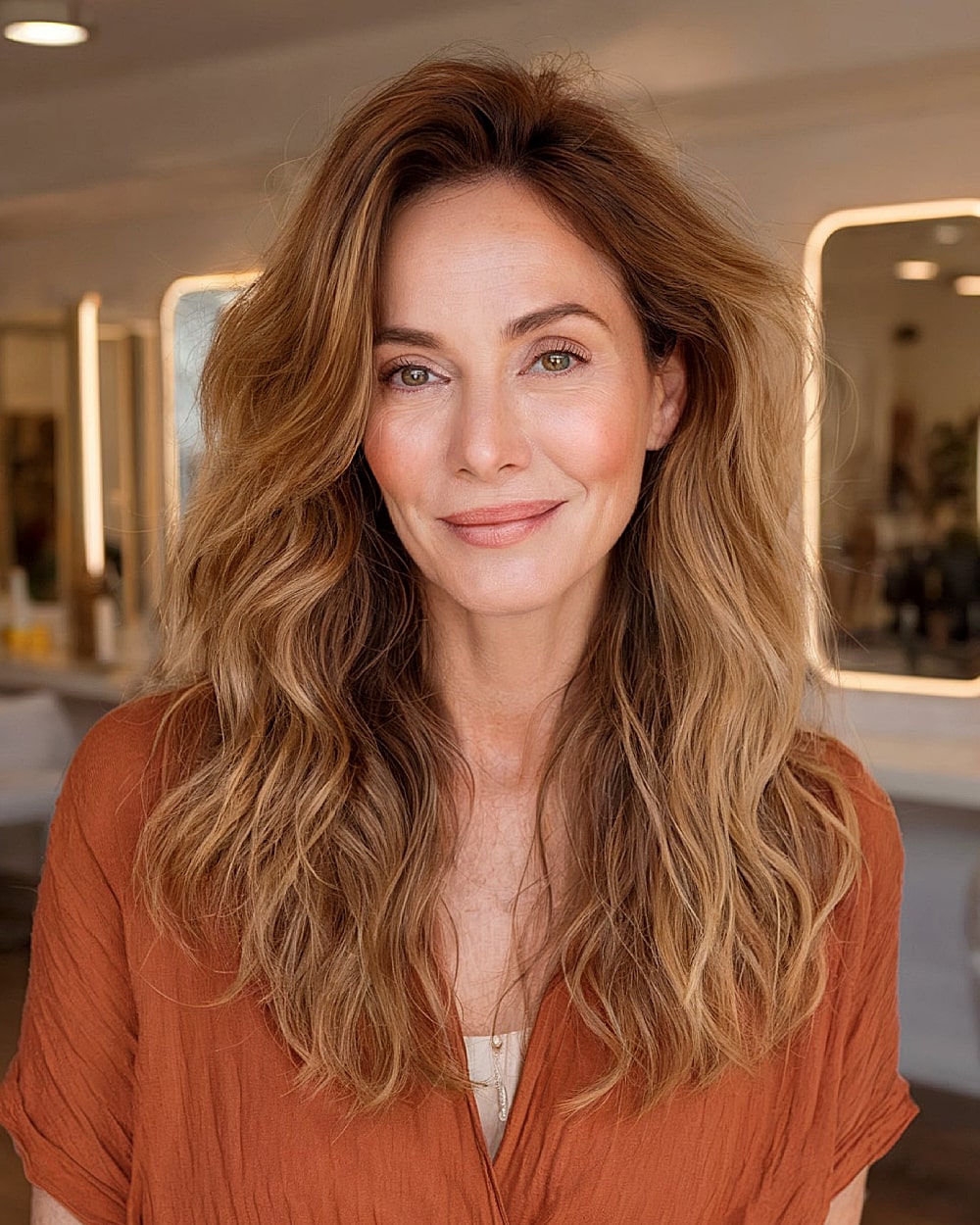 Subtle layering and soft beachy waves give this butterfly cut a natural, sun-kissed finish. Great for women in their 40s who want texture without the drama of high-volume styling. The blend of warm brunette and blonde tones adds dimension while softening fine lines. Works well on medium to thick hair and oval to square face shapes. The style’s flexibility is its biggest strength—air dry or curl for different finishes.