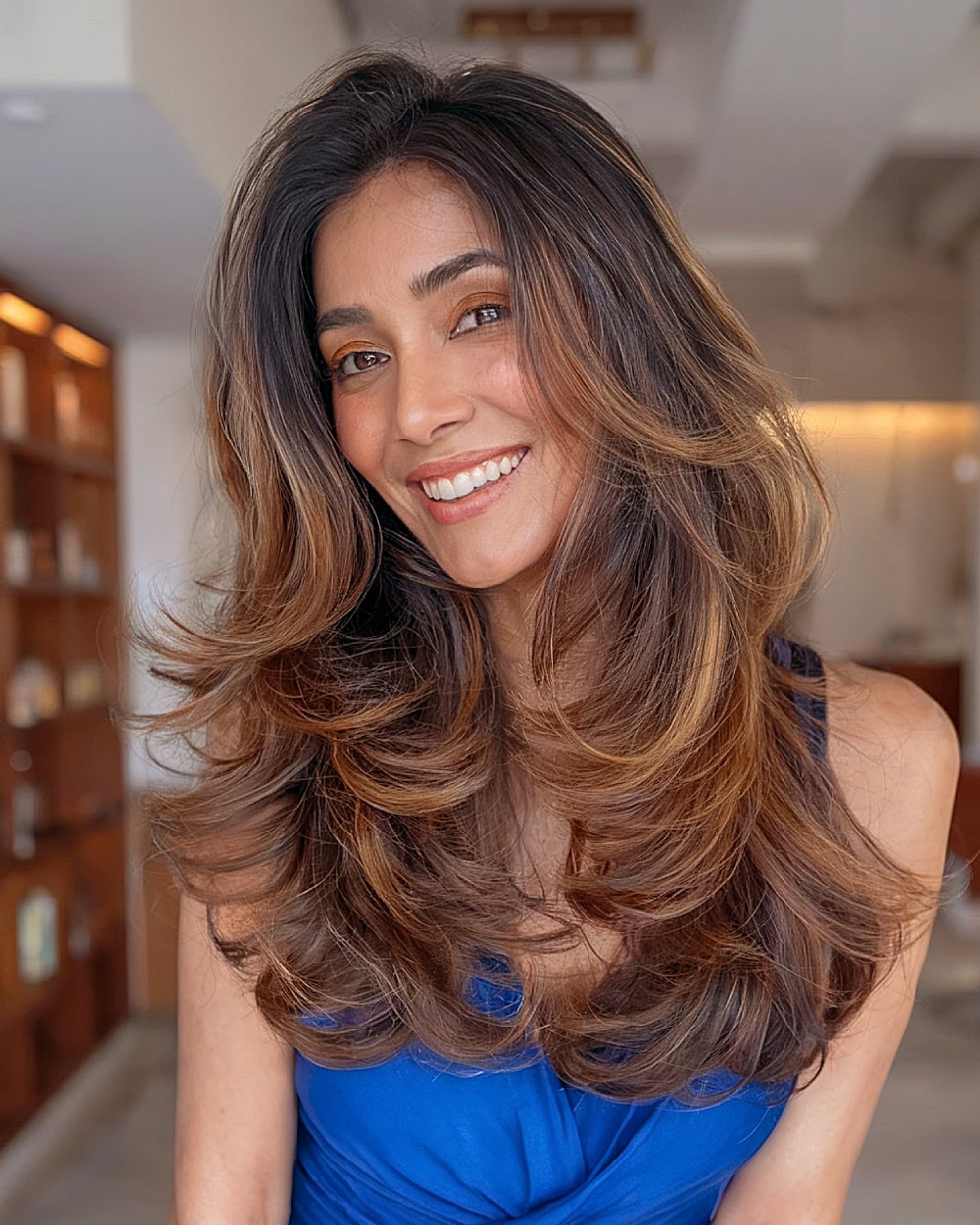 Soft caramel balayage adds brightness and contrast to this full-bodied butterfly cut. Layers are placed to maximize movement without disrupting the length—perfect for women with dense, straight or slightly wavy hair. The style flatters oval and square faces and feels more modern than a traditional layered cut. Balayage keeps color maintenance lower, though root touch-ups may still be needed depending on your base.