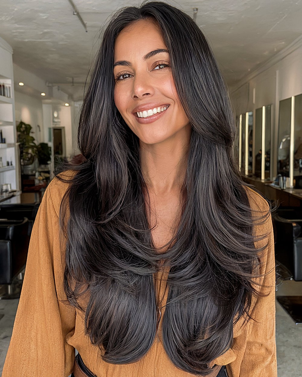 Extra-long lengths paired with internal layering define this classic butterfly style. The smooth, seamless flow keeps weight balanced and movement fluid—perfect for women in their 40s with thick, straight hair who want length without bulk. The center part keeps it symmetrical, while the near-black color makes it sleek and polished. The downside? It takes commitment to keep this much hair healthy and shiny, but it’s stunning when maintained.