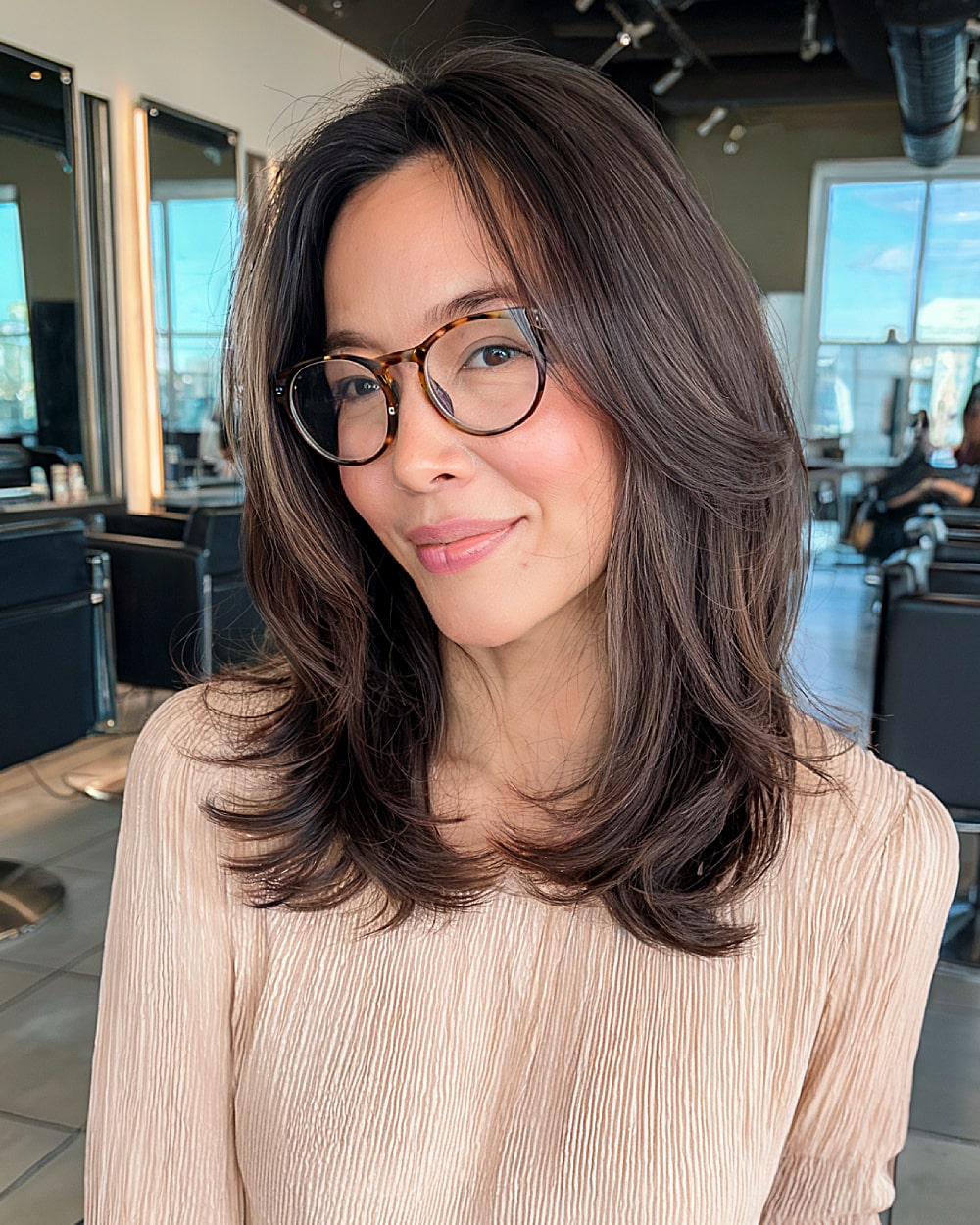 Soft, feathered ends define this medium-length butterfly cut, giving it a polished but approachable finish. The length is perfect for glasses-wearers since the face layers don’t compete with frames. The subtle layering at the cheekbones opens the face and elongates the neck—especially flattering for rounder faces. Best on straight to slightly wavy hair with medium density. Maintenance is minimal, but a round brush is your best friend here.