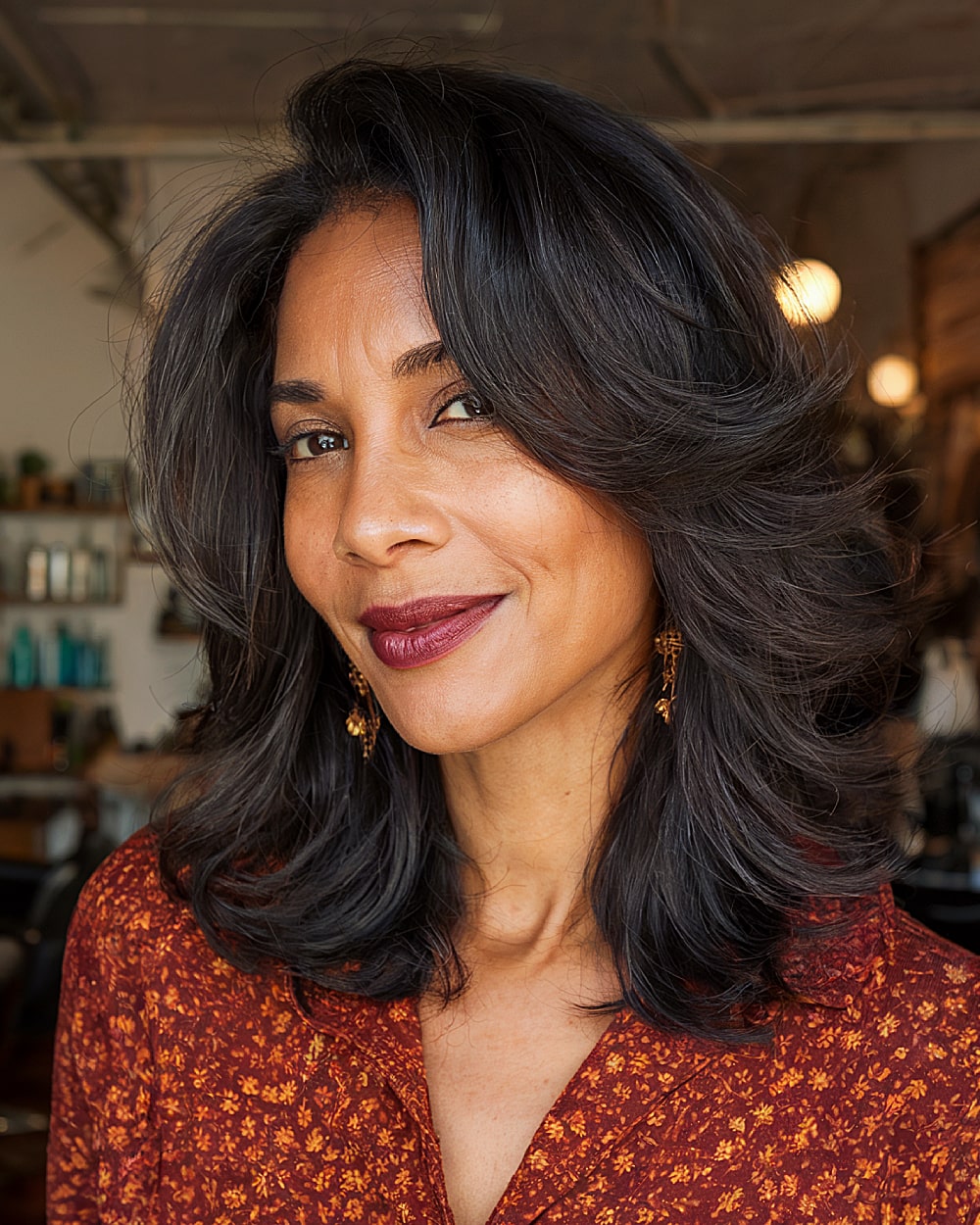 Rich auburn tones and voluminous layering bring this butterfly cut to life. The exaggerated front swoop from the deep side part adds height and drama—especially flattering on fuller cheeks or rounder face shapes. Best suited for women in their 40s with thick, coarse hair that can hold structured layering. One caution—daily styling is needed to maintain the lift and flow. The vibrancy of the color makes this one stand out.