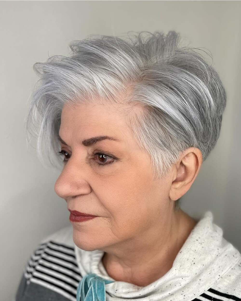 A great choice for women over 60 with very thin hair, this textured silver pixie uses smart layering and a deep side part to create noticeable volume where it’s often lacking—at the crown and sides. The cut is short and tapered around the ears and nape, keeping it easy to manage, while the longer layers on top allow for light teasing or blow-drying for extra lift. It works best on fine to medium-density hair and flatters oval, square, and heart-shaped faces. The bright silver tone enhances the airy, soft texture. Downsides? It may need more frequent trims to keep the shape sharp, especially if your hair grows quickly or flattens easily.