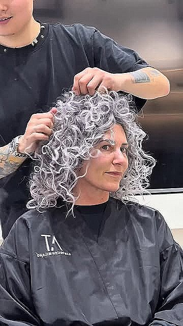 This short curly haircut is a fun and bohemian shape with a shattered bang that will grow out into layers effortlessly. The rounded layers were cut with a straight razor, removing weight for added movement and boosting the curls. This look for women forty plus, was styled with a leave-in conditioner to help with frizz and to add moisture and also a salt spray to boost the curls and add some texture. The shape is great for any curly texture of hair and the length of the layers and bangs can be customized to suit the taste of each individual.