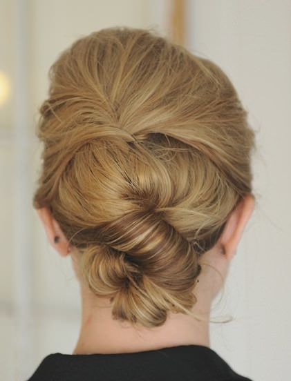 A sweet low updo works beautifully on collarbone-length hair or longer. If you wear shorter hair, I suggest adding some clip-in extensions. Or, try hair padding for more fullness in your bun. Leave out a couple of random tresses around your face for softness. A guaranteed hold for your elegant look will require a strong hold finishing spray.