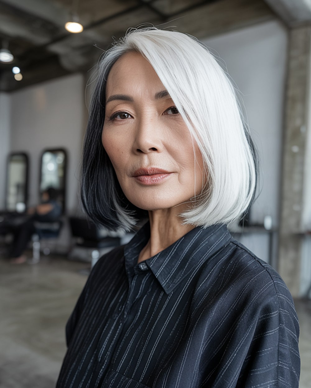 This sharply parted bob showcases a striking black and white color block effect, with the front section dramatically bleached to platinum white while the rest remains a deep charcoal. The sleek finish works best on straight, medium-density hair. It’s a bold look that suits angular face shapes and women who love contrast and edge. The upkeep can be intense—root touch-ups and toning are non-negotiable—but the style pays off in impact and individuality.