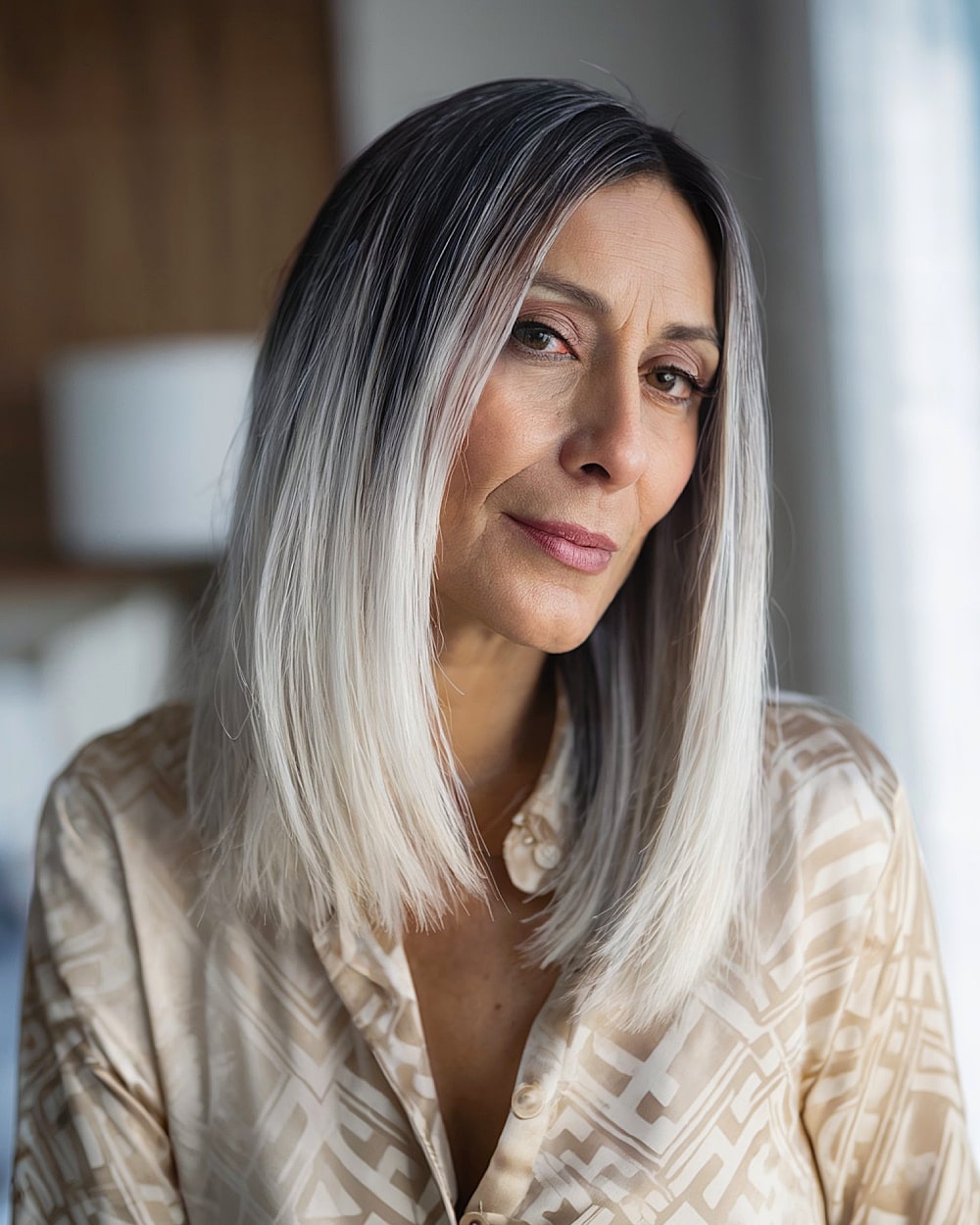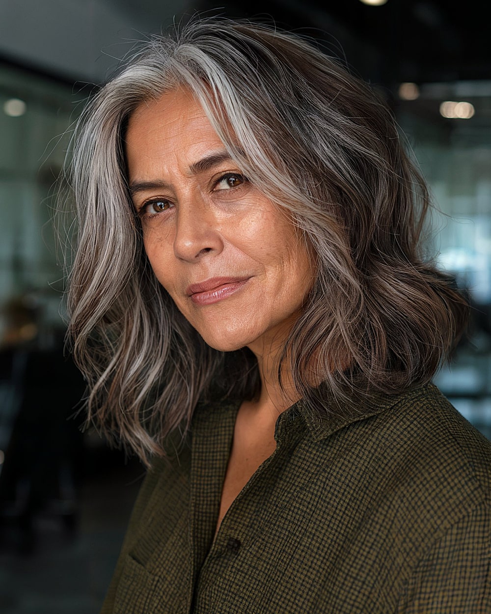 A gentle face-framing blend of brown and white, this layered lob uses light white highlights to brighten the front without overwhelming natural brunette tones. The mid-length shape adds volume and movement, ideal for women with soft waves and medium to thick hair. This style is especially flattering on warm skin tones and helps ease into going gray without full commitment. It’s low-maintenance color-wise but may require occasional touch-ups to keep the brightness fresh.