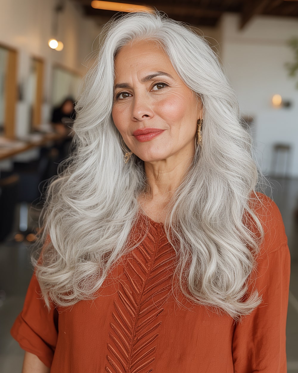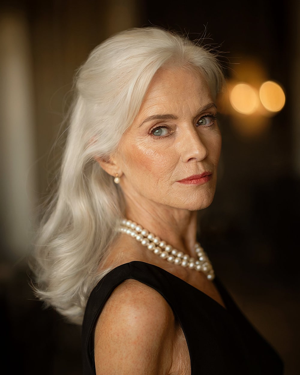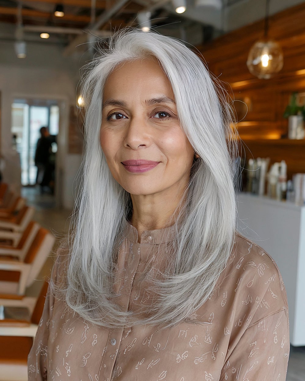The glacisheen finish on this soft silver-white hairstyle creates a pearlescent glow that flatters aging hair beautifully. The shine is the star here—achieved with gloss treatments and minimal heat styling. Soft volume through the lengths adds movement, and the color reads high-end and intentional. It’s best for long, healthy hair that can handle regular deep conditioning. A beautiful choice for formal or everyday wear, but one that demands product TLC to maintain that reflective sheen.