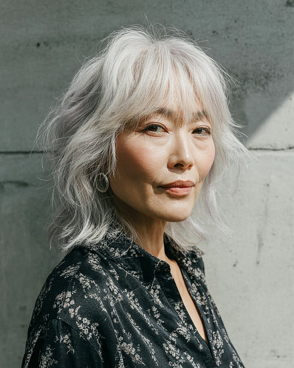 With soft choppy layers and light fringe, this shag-inspired cut works wonders on medium-density hair craving texture. The icy white tone enhances the cool, modern feel, while the layered ends give the style a weightless lift. It suits angular face shapes best, adding a softness that’s flattering. This style is great for air-drying and tousled finishes, but you’ll want a good texturizing spray on hand. A potential downside is that finer hair types may need more effort to keep it from going limp.