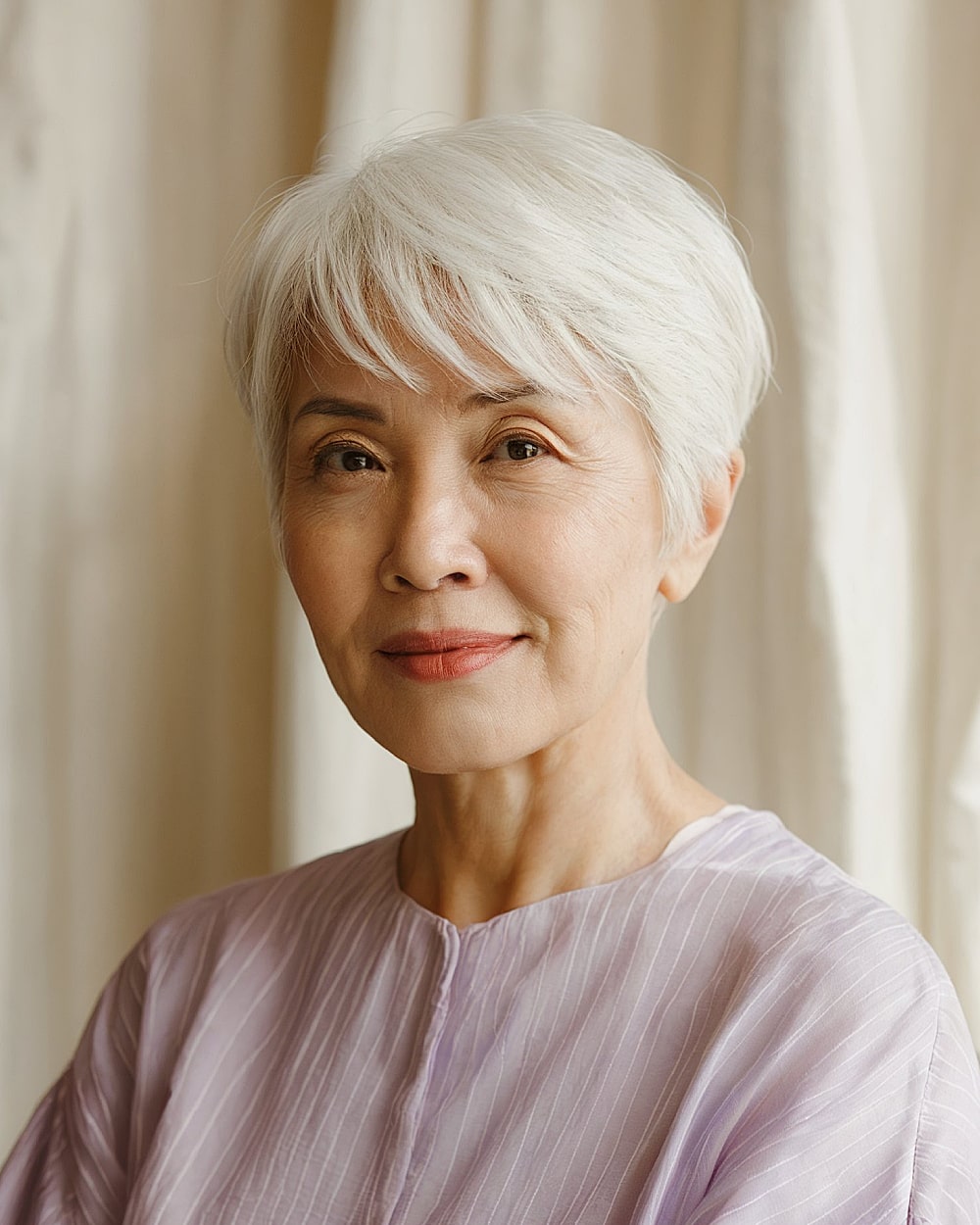 Polished yet easygoing, this tapered pixie has a beautiful silhouette that hugs the head with soft layers and light feathering around the crown. The side-swept bangs offer some forehead coverage, which helps soften aging lines and brings focus to the eyes. It suits petite face shapes and works especially well on women with straight, fine to medium-density hair. This shape air-dries well and is easy to maintain, but you’ll want trims every 4–6 weeks to keep the taper clean.
