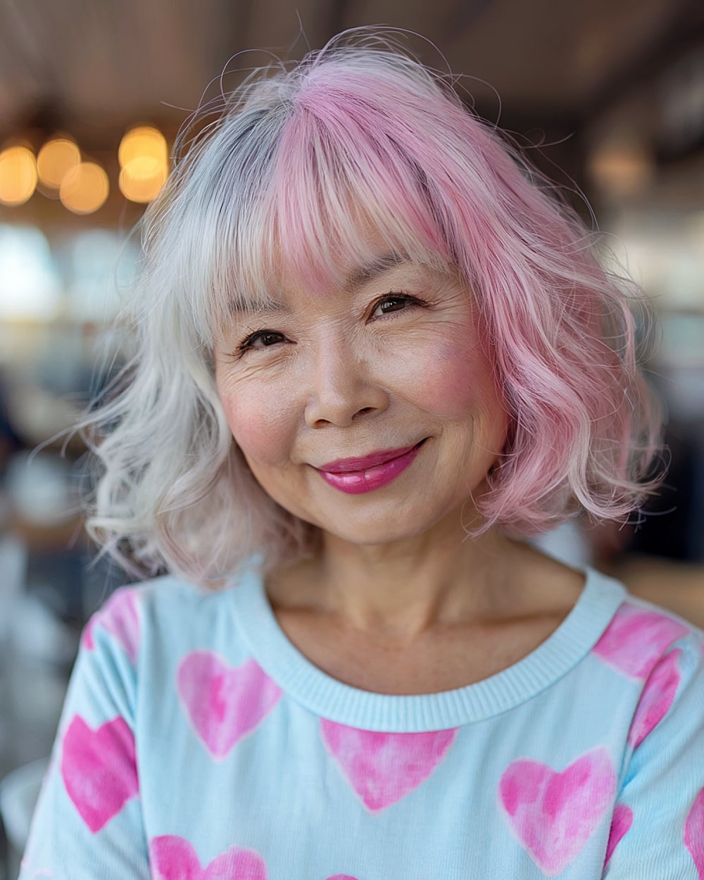 Whimsical and soft, this white and pastel pink blend adds cheer through a curly bob shape and blunt fringe. Perfect for women with naturally wavy or permed hair, this look is youthful without trying too hard. The pink tones are placed in the bangs and side sections, lifting the face visually. Ideal for fine hair that needs volume. Downside? Pastels fade fast, so you’ll want a color-depositing conditioner to stretch your salon visits.