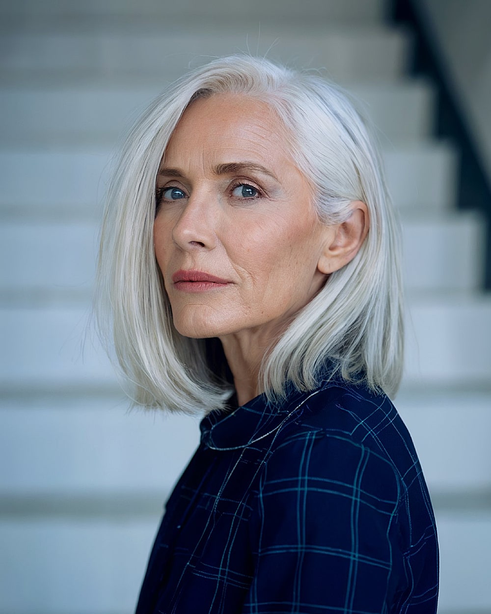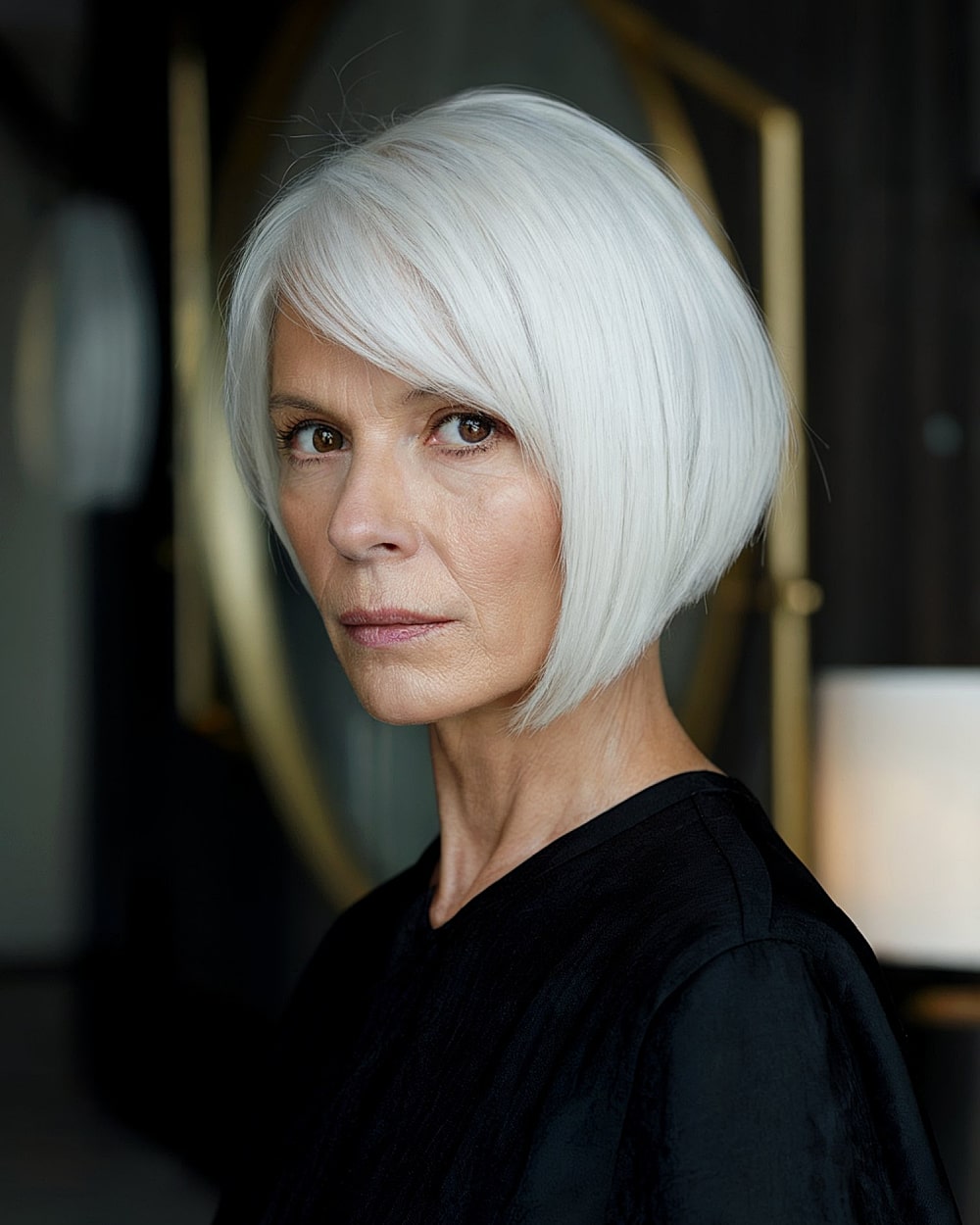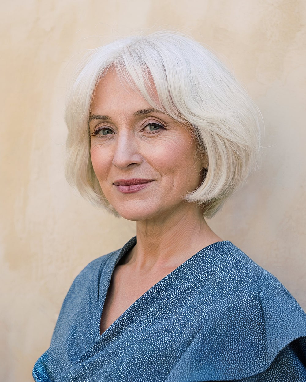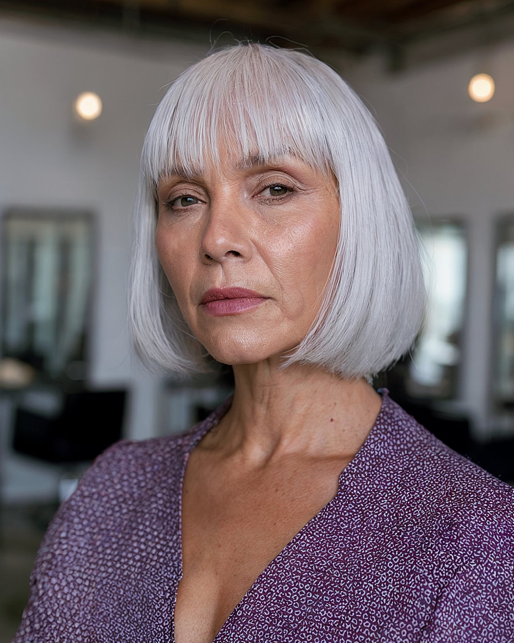 Classic and structured, this chin-length blunt bob with bangs creates a strong frame around the face. The solid white tone adds polish and contrast, especially for women with cooler skin tones. Best on fine, straight hair, this look is sleek but does expose every flaw—split ends and frizz need frequent smoothing. The bangs bring focus to the eyes, making it great for women with longer foreheads or rectangular face shapes.