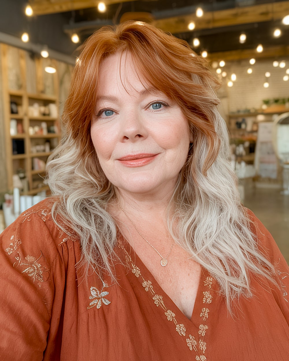 This medium-length cut uses soft layering and a subtle ginger-to-white balayage to create a sun-kissed, lived-in finish. It works best on warm undertones and adds brightness without harsh contrast. The feathered ends give a soft flip, perfect for women with finer hair looking to boost shape and lift. The color grow-out is forgiving, though the white portions may need purple shampoo to stay crisp over time.