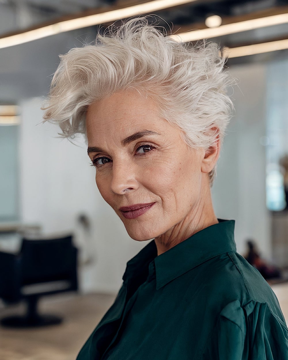 This bold, feathered cut is ideal for women who love volume and edge. It’s heavily textured at the crown, giving it a lifted, tousled shape that works especially well for finer hair types. Great for round and square face shapes, the choppy layers draw attention upward. The white color looks bright and modern, but the style does require styling products like mousse or root-lifter to keep the shape. It’s low-maintenance in cut frequency, but daily styling is key to keep that airy lift.