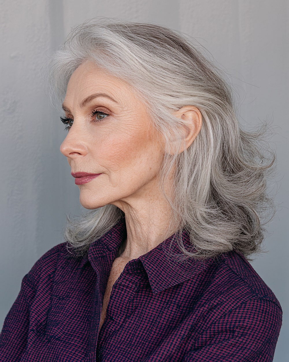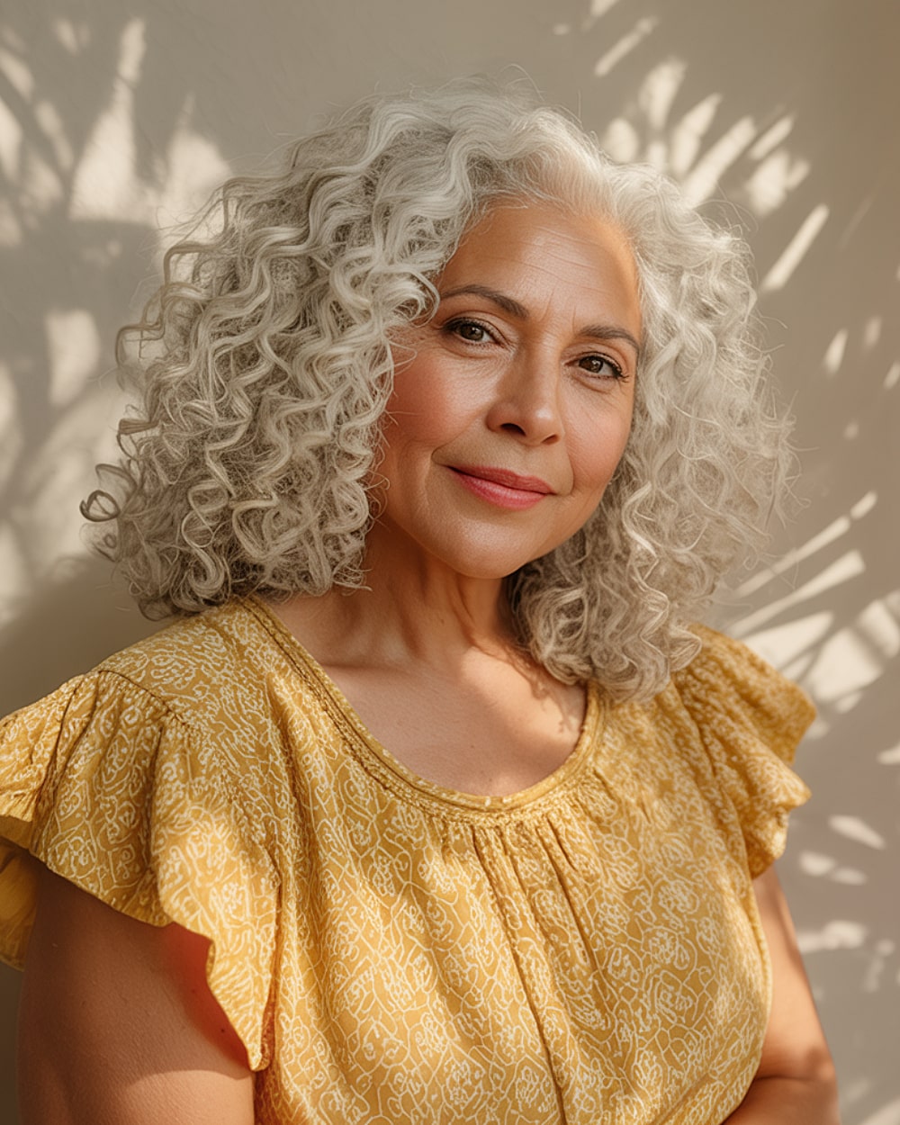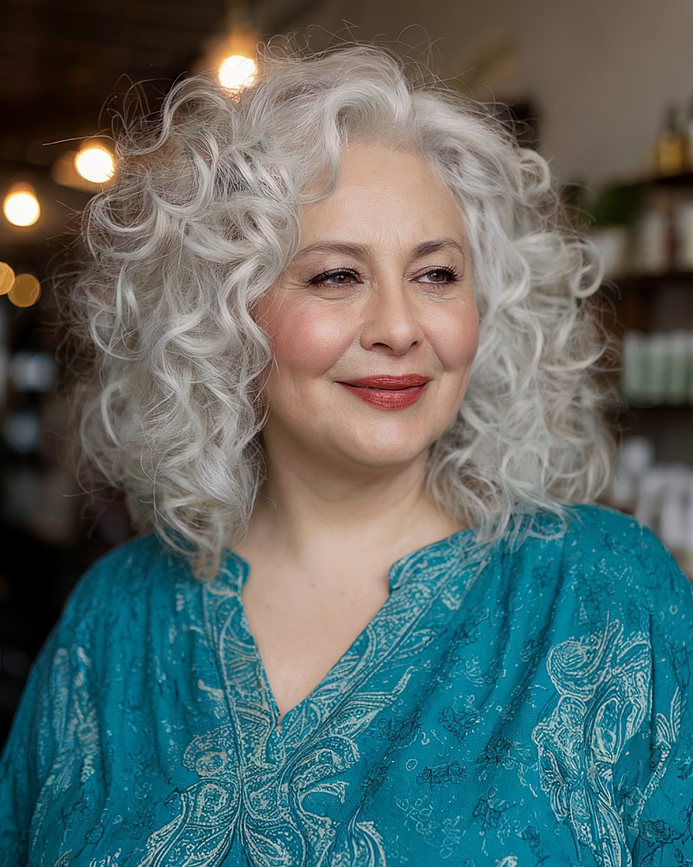 Full of volume and bounce, this look enhances natural curls with a slightly rounded shape that lifts at the crown. Ideal for women with thicker, coarse curls, the shoulder-length cut helps maintain manageability without losing fullness. The silver tone is bright without being stark, which is a plus for blending natural grays. You’ll need curl-defining products and hydration to avoid frizz, but the payoff is a joyful, full-bodied look that feels youthful and energized.
