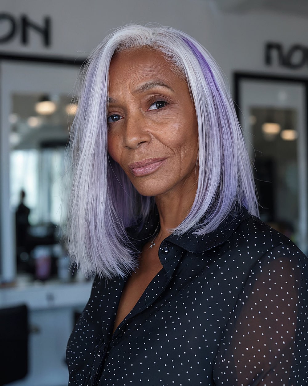 Chunky purple streaks add flair to this otherwise sleek white hairstyle, giving it an artistic, alternative look. The hair is straightened smooth, enhancing the contrast. Best on fine to medium hair types, this look thrives on precision and regular trims. The purple will fade quickly, so plan for semi-regular refreshes or switch to pastel tones over time. It’s fun and eye-catching, but does demand some product commitment to keep colors vibrant.