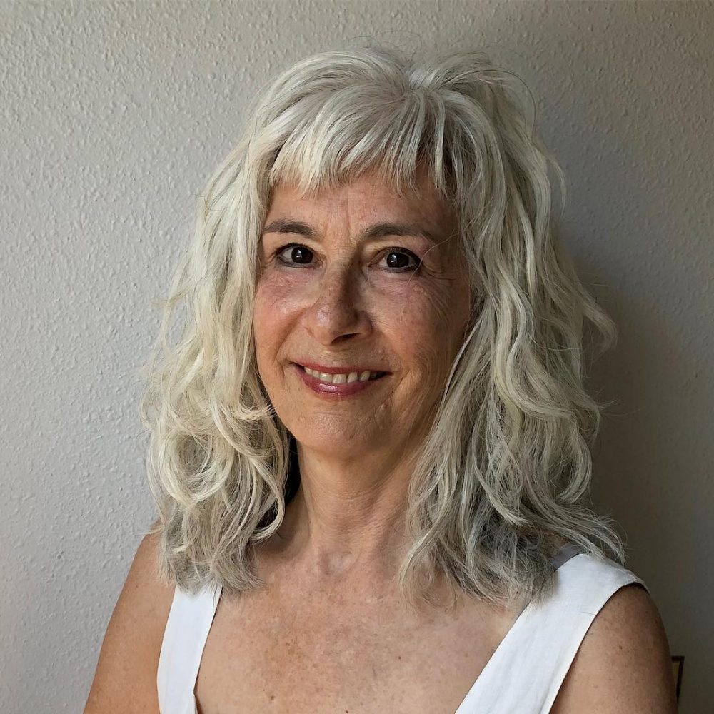 Shoulder-grazing silver curls can really give you a carefree boho feel. If you don’t have natural curls, a perm can absolutely solve that problem. Ask your stylist for square layers to maintain the length of the crown. Apply a curl-enhancing product to your curls and either air dry or use a diffuser. Refrain from running your fingers through as you dry to reduce frizz.